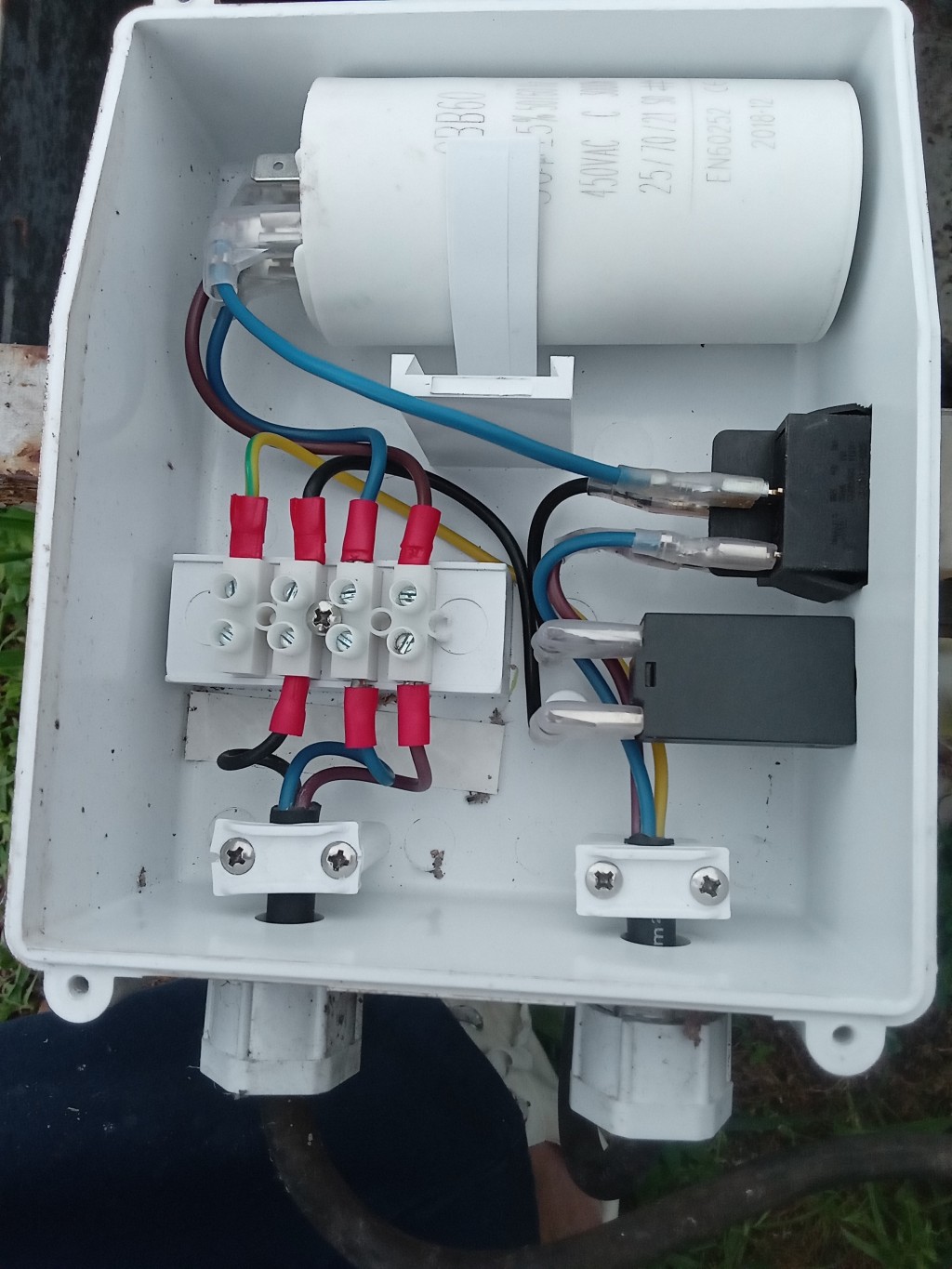 старата ми сондажна помпа издъхна и си купих нова. Работата е там, че новата помпа е без защита, а старата имаше отделно кутия със защита, която искам да използвам на новата. Тъй-като в новата помпа пусковия кондензатор е в корпуса на помпата, а при старата е в кутията за защита, идеята е да се елиминира пусковия кондензатор в кутията Бна старата помпа. Прикачил съм снимки от капака и вътрешността на кутията от старата ми помпа.