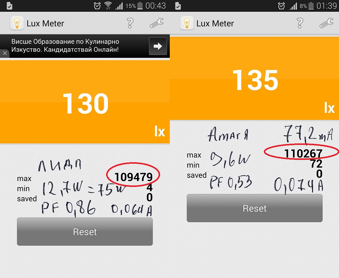 Това е приложение за телефон и е само примерен за сравнение, като и двете крушки са измервани плътно до балона.