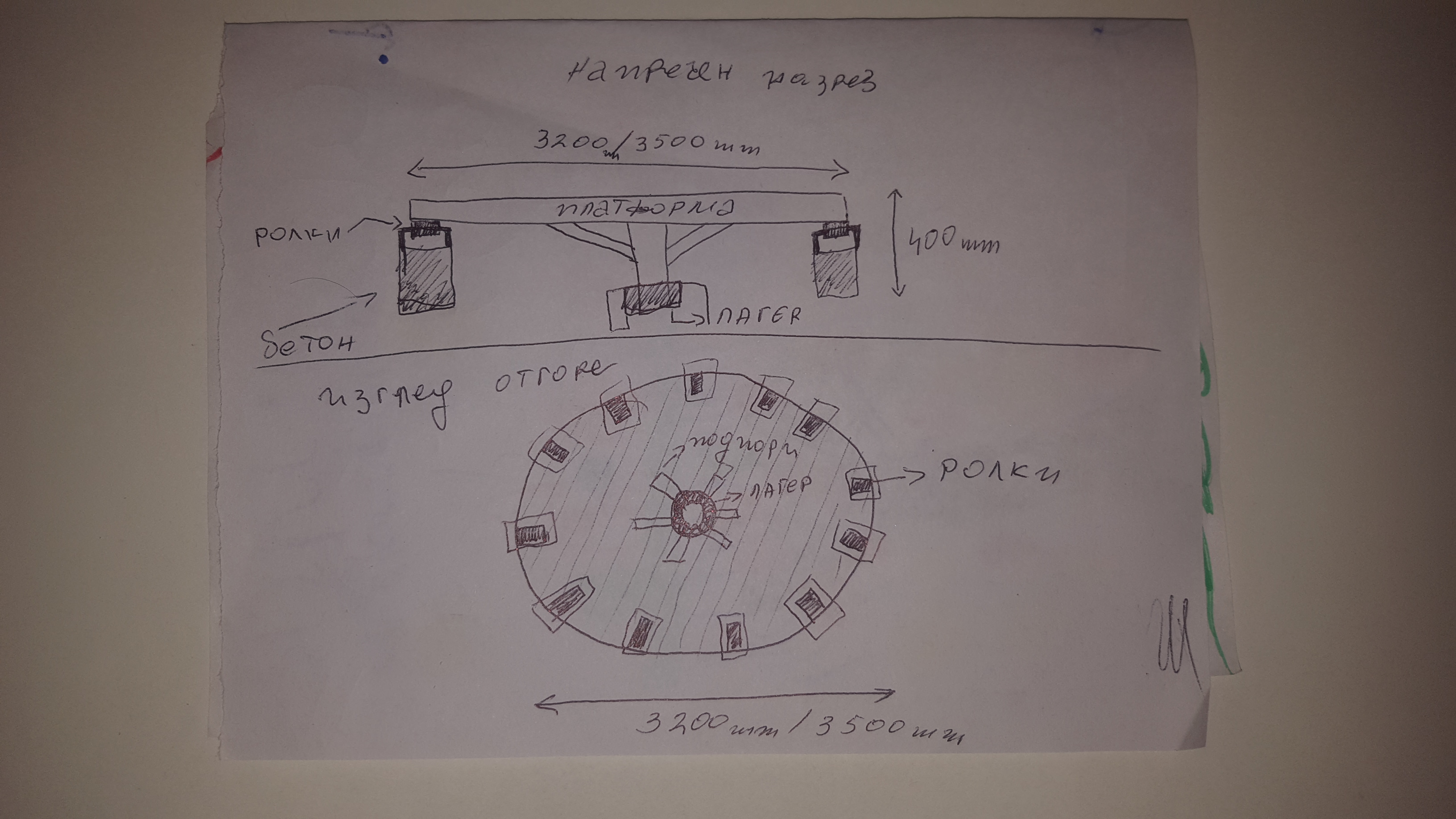 Имам неизползваемо място в двора. Мога да копая до 600мм в дъчбочина. Броят на ролките/лагерите ще зависи от това каква тежест могат да носят, като мисля да ги удвоя. Конструкцията не мосля да е по-тежка от 300кг., за да мога да се вместя в 2тона заедно с колата и двама трима в нея... Това е само идея какще изглвжда платформата под повърхността...
