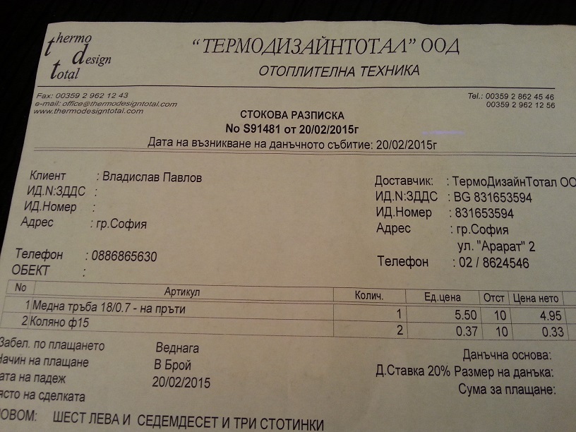 Темата приключи, но щом е рекъл...Обясних му на майстора, че крановете се ползват единствено и само при авария. На бойлера- при спукване на серпентината го затваряш, спасяваш къщата от наводняване и вечерта семейството се къпе. САМО В ТОЗИ СЛУЧАЙ СЕ ПОЛЗВА, НАВОДНИТЕЛЬО. При авария, подмяна или снемане за ремонт на водната риза са нужни холендри или кранове(най-добре и двете), които се ползват само и единствено в този случай. Затваряш или затапваш и топлиш на термопомпа. същото се отнася съответно и за топлообменника. Оправдания много. На крива ракета и космоса е крив. Майстора преди него (фактически този, който после прати Владо) беше спазил тези неща. И не цепиш серпентината, след като изходния е винаги отворен 300%. Имало идиоти...Има и убийци, пък живи хора все още има. Тъпо оправдание, когато не ти се работи. При притваряне на вентила налягането се изравнява, какви ги говориш. Просто сложи редуцир вентил. Ако искаш с още 20% отгоре, точно ти ще си стоиш в къщи завинаги. Бил учил техникум и не знам си какво...Аз съм учил за космонавт. Пълни глупости с а това за данъчните и че имаш фирма. Никой не е виждал касов бон, фактура или хартийка от теб за извършена работа, която да послужи като гаранция 2 години. Нещо повече: дори пазаруваш като частно лице. Лъжец и мошеник отвсякъде. Не се заяждай бе човек, просто ми донеси парите, които ми дължиш и по живо по здраво. ДДС-то ти слабо ме вълнува.
