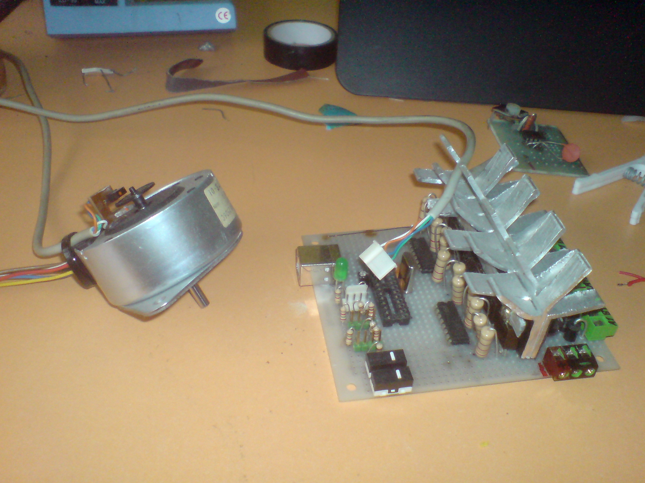 За това реших да направя хибриден двигател с подръчни средства. За сензор за положенито ползвам сензор от стара мишка с топче.Двигателя ми струва 1лев от пункт за желязо изкормих го от копирна машина.За контролер използвам PIC18F2455.Свързва се с компютъра чрез USB.