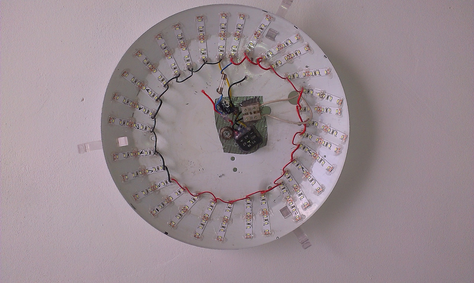 пс. Доста си понагрейва плафона така, сигурно към 50-тина градуса :-D Явно ще се наложи да ги преправя само на един кръг с поне 25 лентички, но ме притеснява, че ще свети доста слабо така, иска ми се поне на 90w крушка да се равнява светлината. Обичам да ми е светло. :lol: