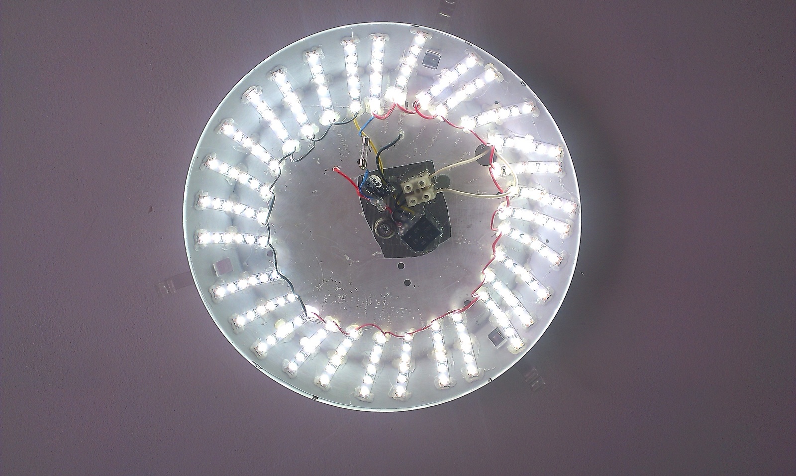 Днес направих плафона с диодите 3014, които уж ги дават от 900-1200Lm. на метър. Направих два кръга по 20 лентички с 6 диода на лентичка. Напрежението след греца без филтриращия кондензатор го замерих 211v, но сложих един 400v/ 10mf и напрежението се вдигна на 274v, което явно ще наложи да добавя още лентички на всеки кръг, или просто от единия кръг ще прехвърля няколко от лентичките, а другите ще ги изключа. Аз до колкото знам диодите не ги плаши много напрежението а големината на тока. Ето данните за този тип диоди 3014 - http://www.apt-hk.com/upload/201371816831668.pdf Така както свети сега с двата кръга диоди е много силно, сигурно към 120-130w обикновена крушка. На мен ще ми трябва да свети колкото 90-100w крушка. Един кръг с 25 лентички ли да направя, или да добавя и към двата кръга по още 5 лентички, какво бихте казали?:) Под диодите съм облепил целия плафон с едно доста здраво изолационно тиксо-лента, за всеки случай, да няма заря :)