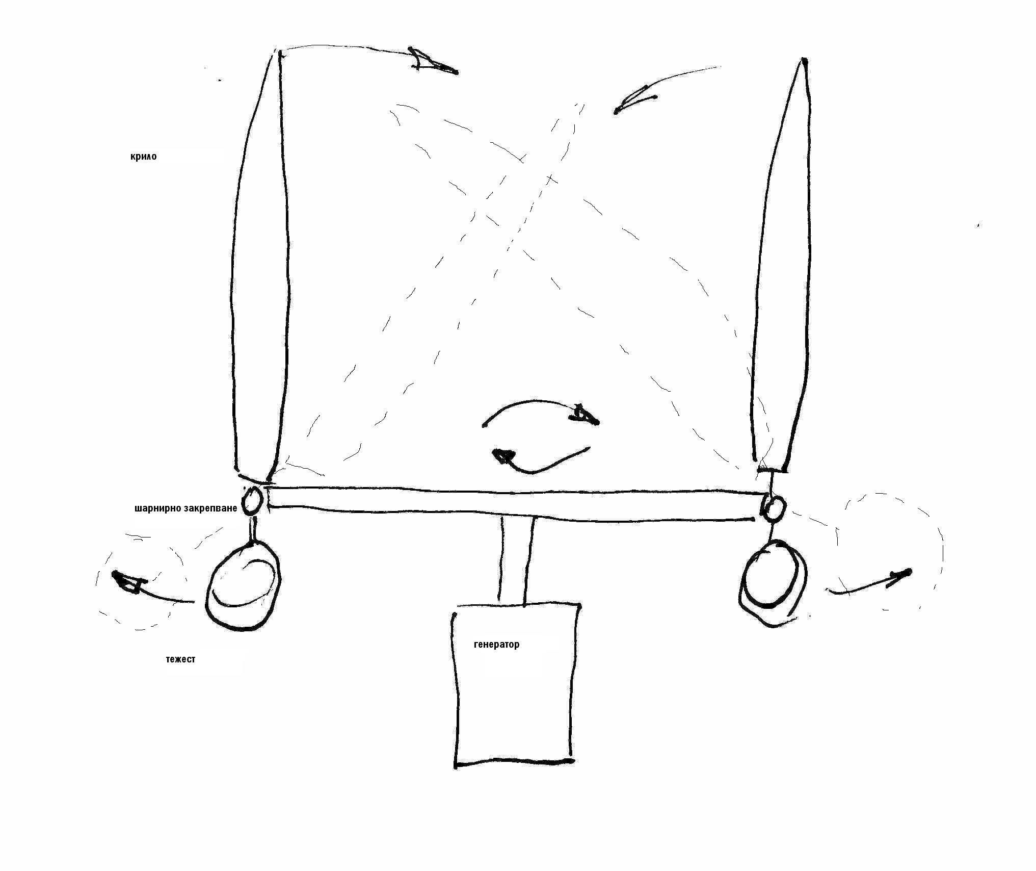 Ползва се отново крила но закрепени в края на хоризонтална основа така че тя се върти. Някаква комбинация от ротора на Савониус. А самите крила са закрепени вертикално шарнирно и от долната страна има противотежест. При промяна на скоростта на вятъра от центробежните сили тежестите започват да преместват крилата така че върховете и се събират към центъра на въртене. И при много голям вятър почти се събират. Би ли била ефективна една такава система защото след обсъжданията по нагоре относно площ и брой витла ми се струва че би трябвало да работи със същата ефективност на класическото витло. Интересна ми е защото колкото съм се ровил по форуми не съм срещал някой да я е реализирал. Ако не е ясно за какво иде реч ще се пробвам да рисувам ако трябва. А по спомени е реализирана фабрично за захранване на някакви магистрали в Англия.