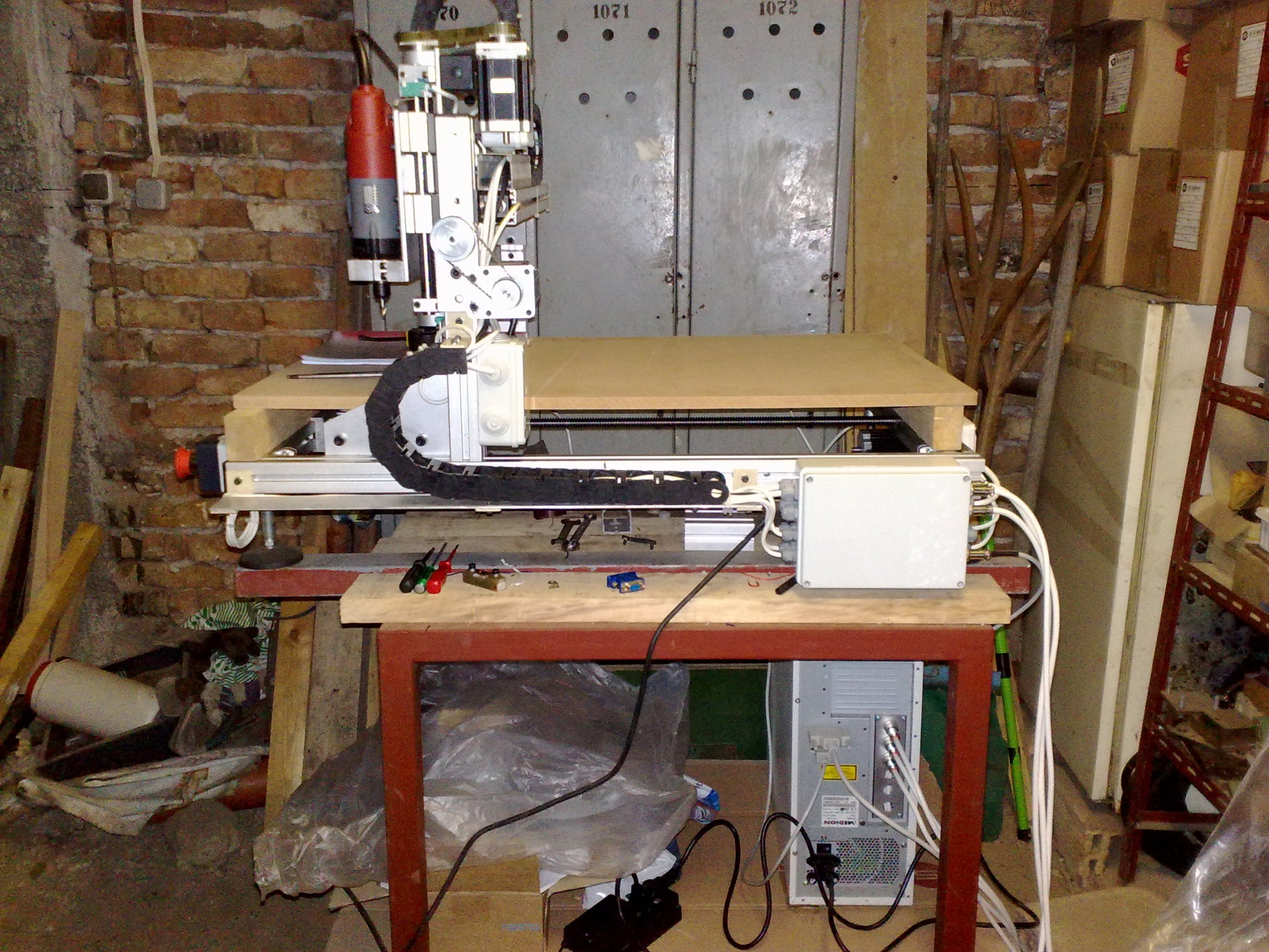 Да се похваля! И аз имам вече работеща машина. Работно поле 640х440мм. Драйвери CW5045. Двигатели 60BYGH301B. Контролер от Сириус - K3AX/OPTO, събран от мен. Цялото управление монтирано в кутия от компютър. Шпиндел - KRESS 800 FME.
