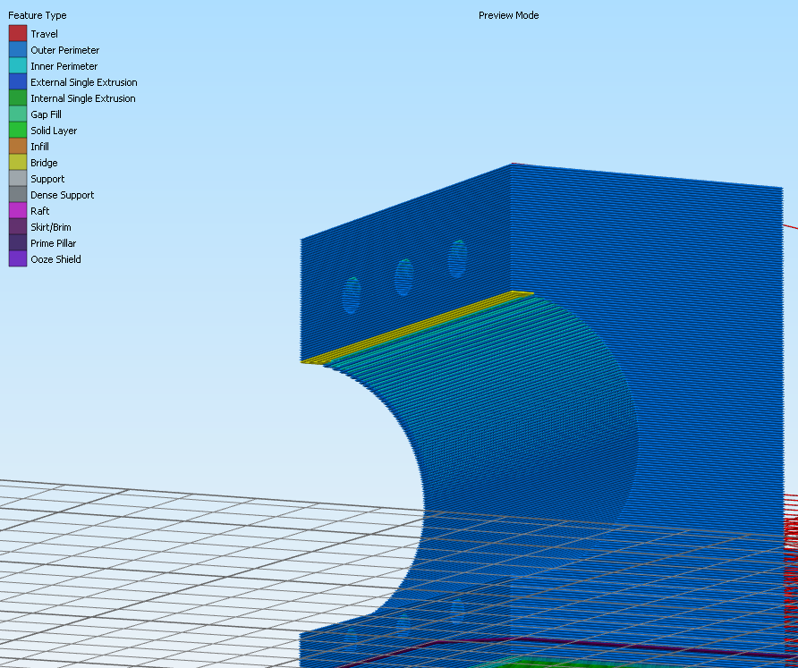 този печат с 0% запълване го направих защото самият 3D модел го позволяваше. Със запълване изглеждаше по-лошо защото материалът, който ползвах е полу прозрачен и си личаха стените от поддръжката. При S3D-то, като слайсер има подсказване къде ще се печата във въздуха. На снимката се виждат словете в жълто: