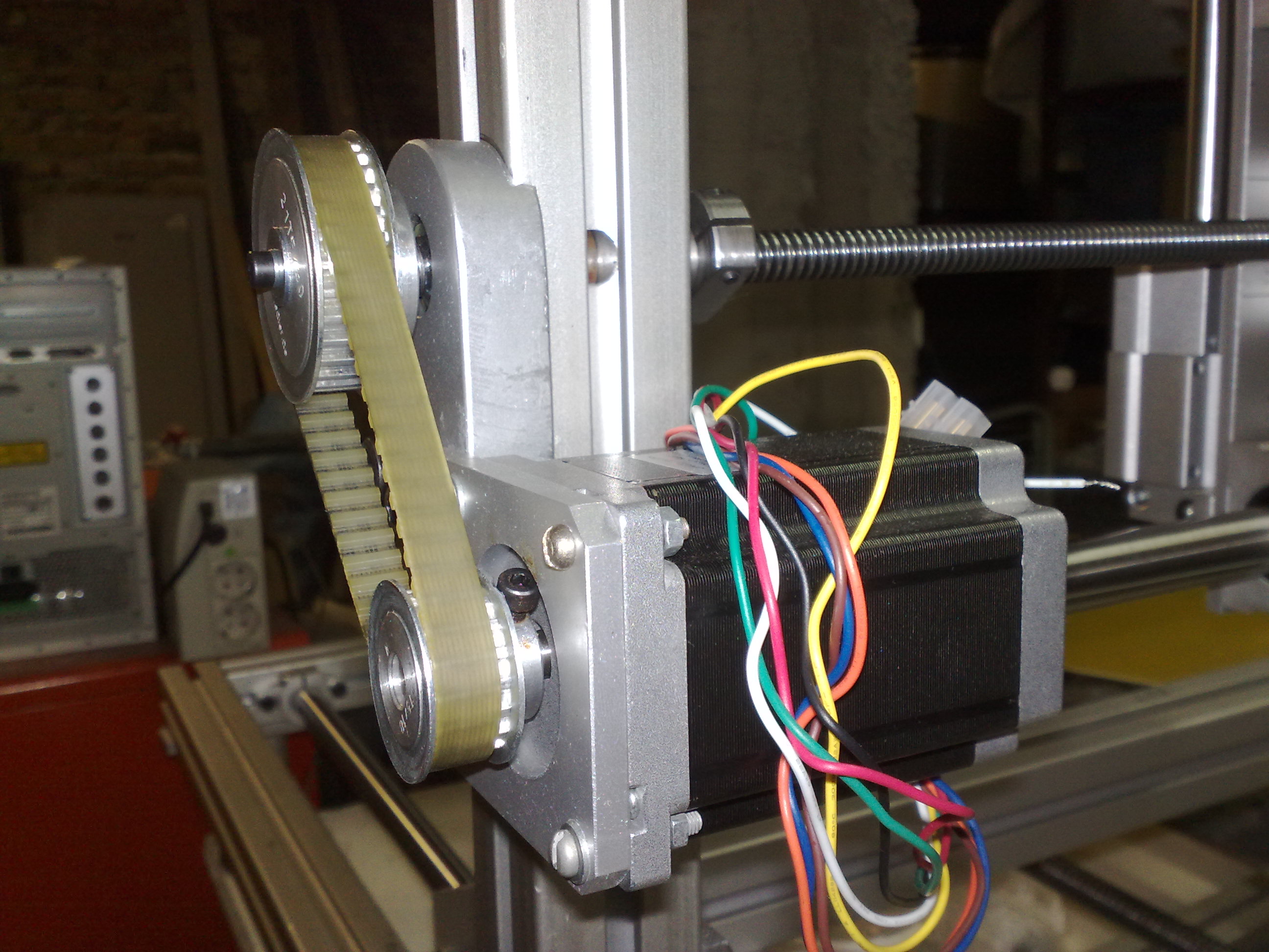 Оня ден при ръчно движение надолу по Z за търсене на Z=0 нещо блокира и инструмента заби в материала. Спасението, докато спра машината, дойде от ремъчната предавка, която започна да прескача зъби. На снимката е задвижване по Y в етап от построяването на машината. По Z е подобно.