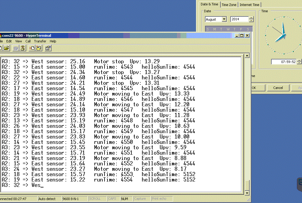 Сутрин се изчаква 30 минути след старта. Мотора се пуска на изток и при падане на напрежението под 8V се спира, изчаква се 10 минути и пак. Тази сутрин е имало 3-4 включвания на релето за движение на изток.