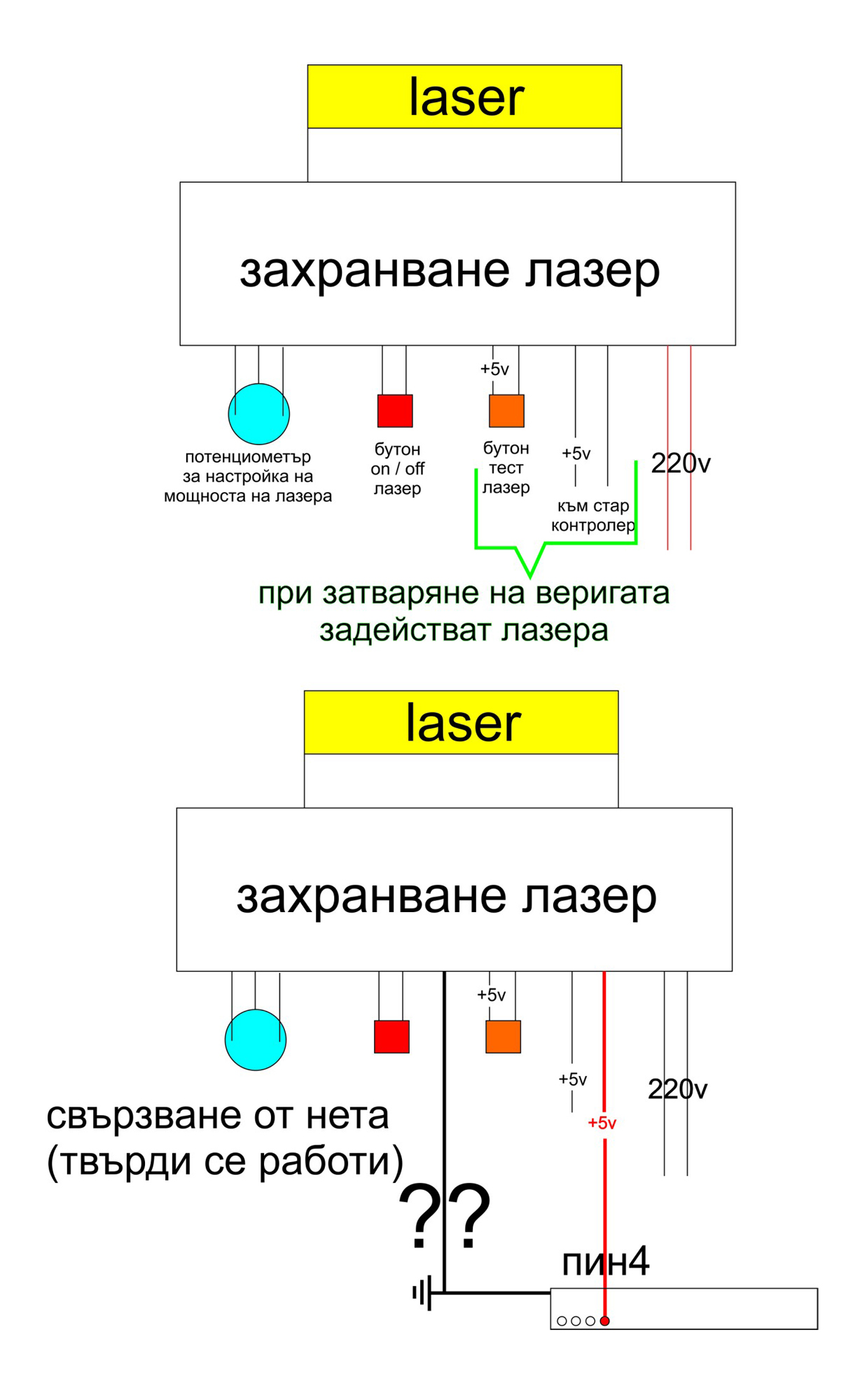 Това са инструкциите на контролерите. На 9 ми е даден шпиндела. Паленето на лазера се осъществява с два кабела 5волта, които се комутират. Лазера си има потенциометър за регулиране на мощноста, и тест бутон. Началната идея ми беше взета от нета и се състоеше в вземане директно от пин4 на +5 волта и да ги подам в платката на лазера както правеха повечето, изглежда има някакъв проблем с ground между компа и платката на лазера и не се подава сигнал, затова почнах всичкото това вариране по темата. Идеята за командите за старт и стоп ми допадна много, но изглежда версията на програмата не го позволява.