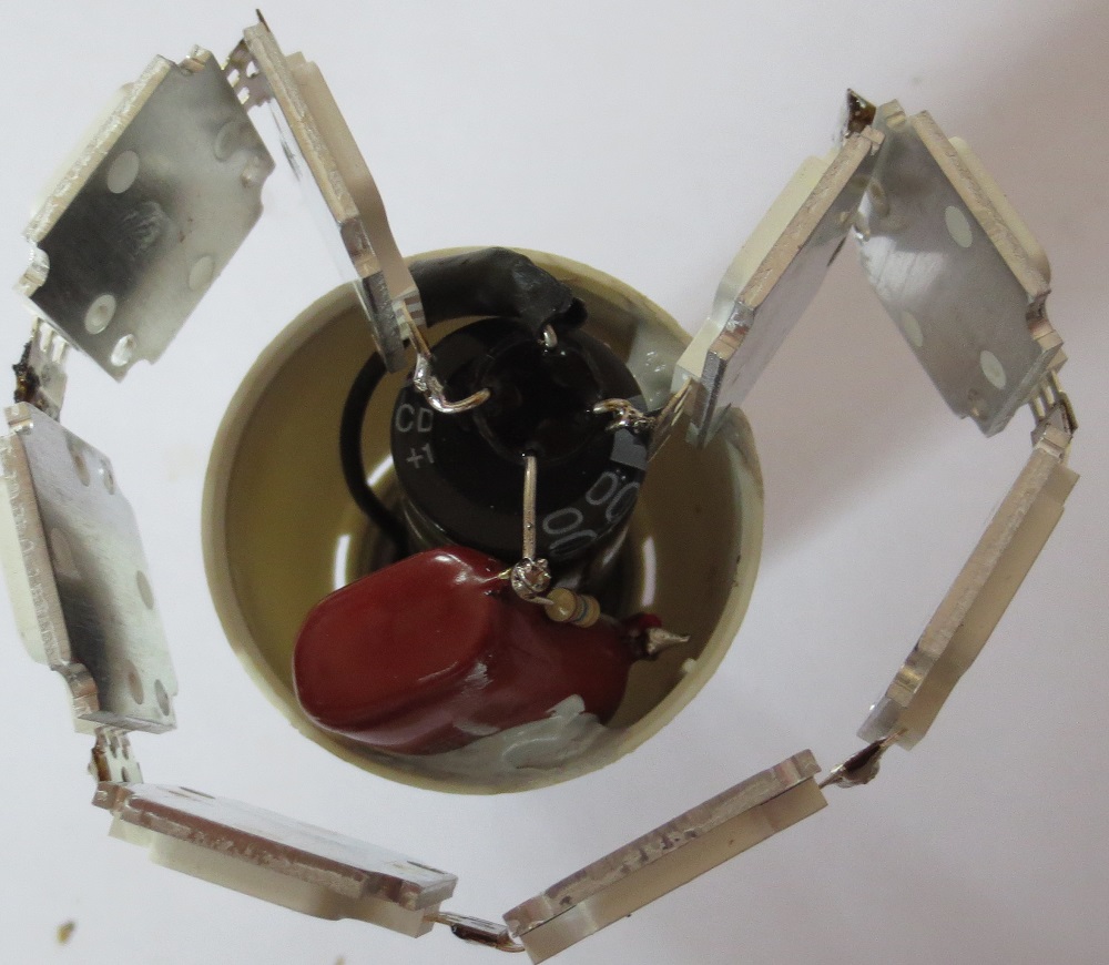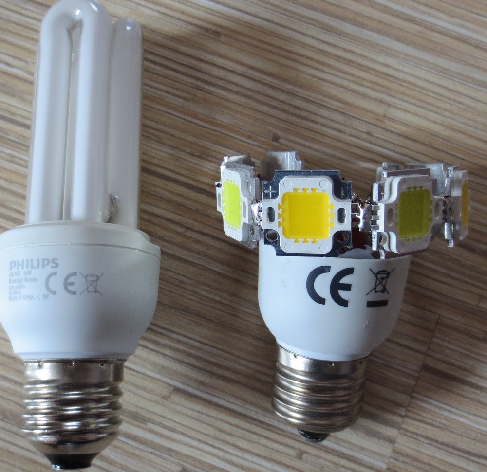 Онзиден с колегата попаднахме на много интересни лампиони, в които бяха комбинирани Е27 крушки. Една част от крушките бяха стандартни ЛЕД (с матиран балон и тежички), но някои бяха ето такива: