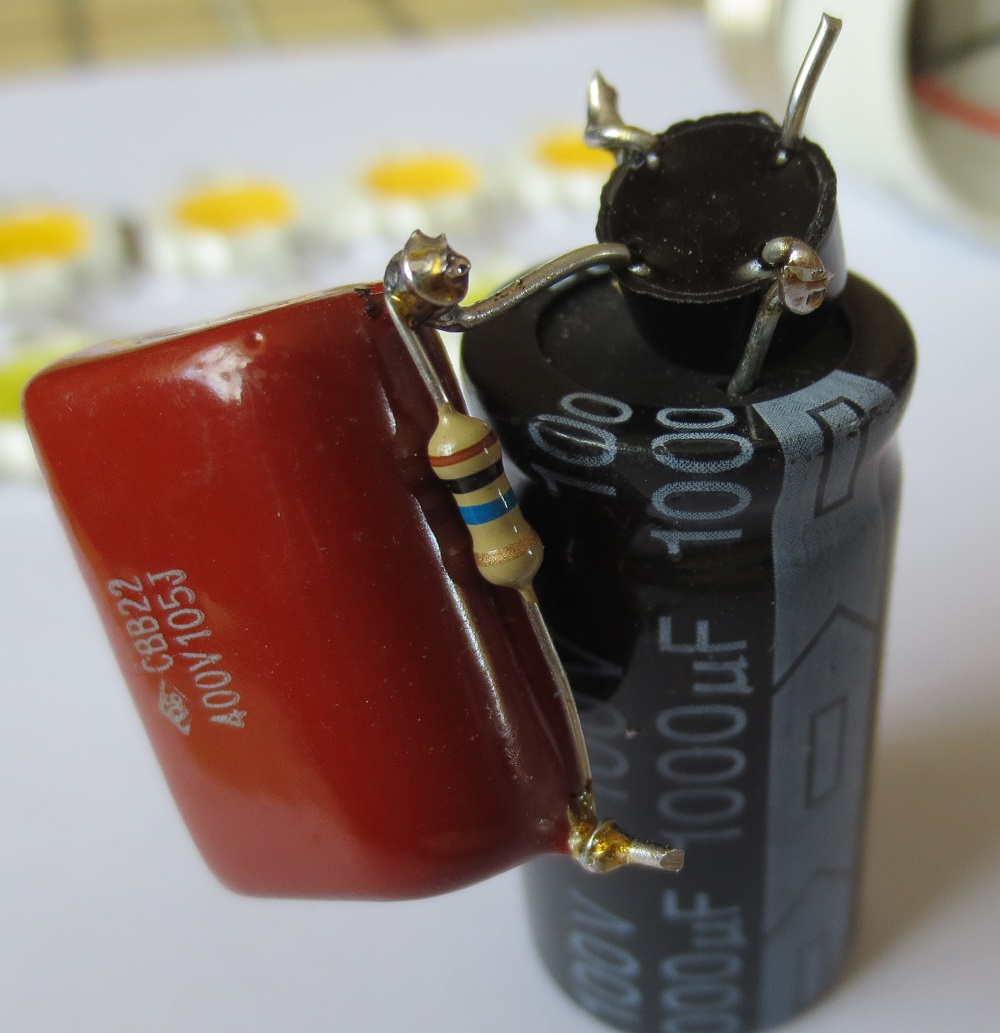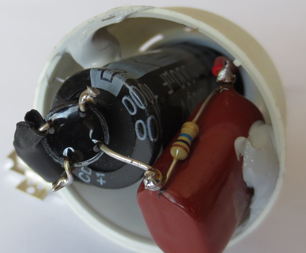 Схемата на захранването се вижда. Резисторът е 10МΩ/0,25W, грецът е 1,5А/1000V.