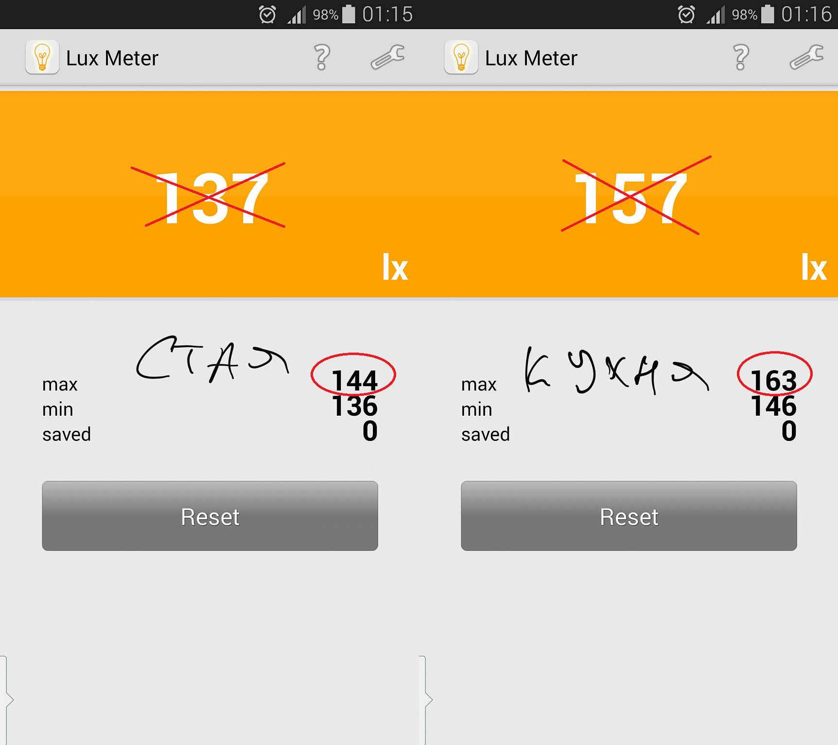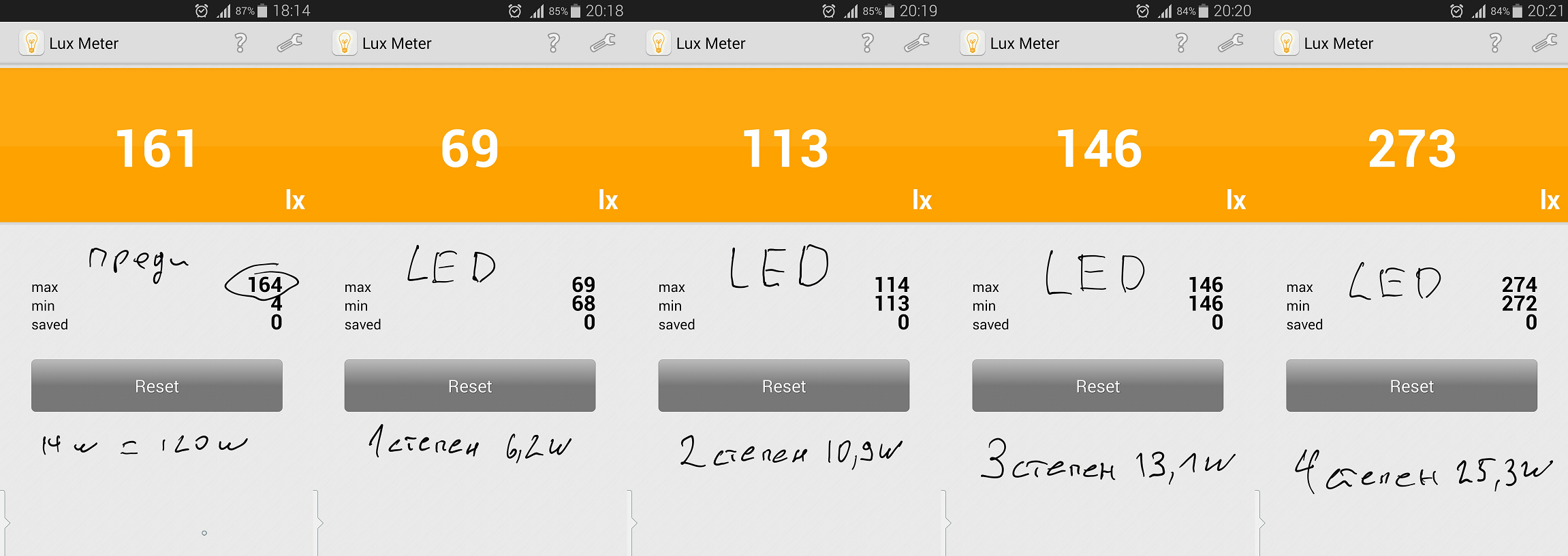Преди да сваля 14W-та крушка която отговаря на (120W нажежаема) с GSM-а сложен на масата под лампата премерих колко лукса се получават за да сравня после с плафона а ето ги и резултатите: