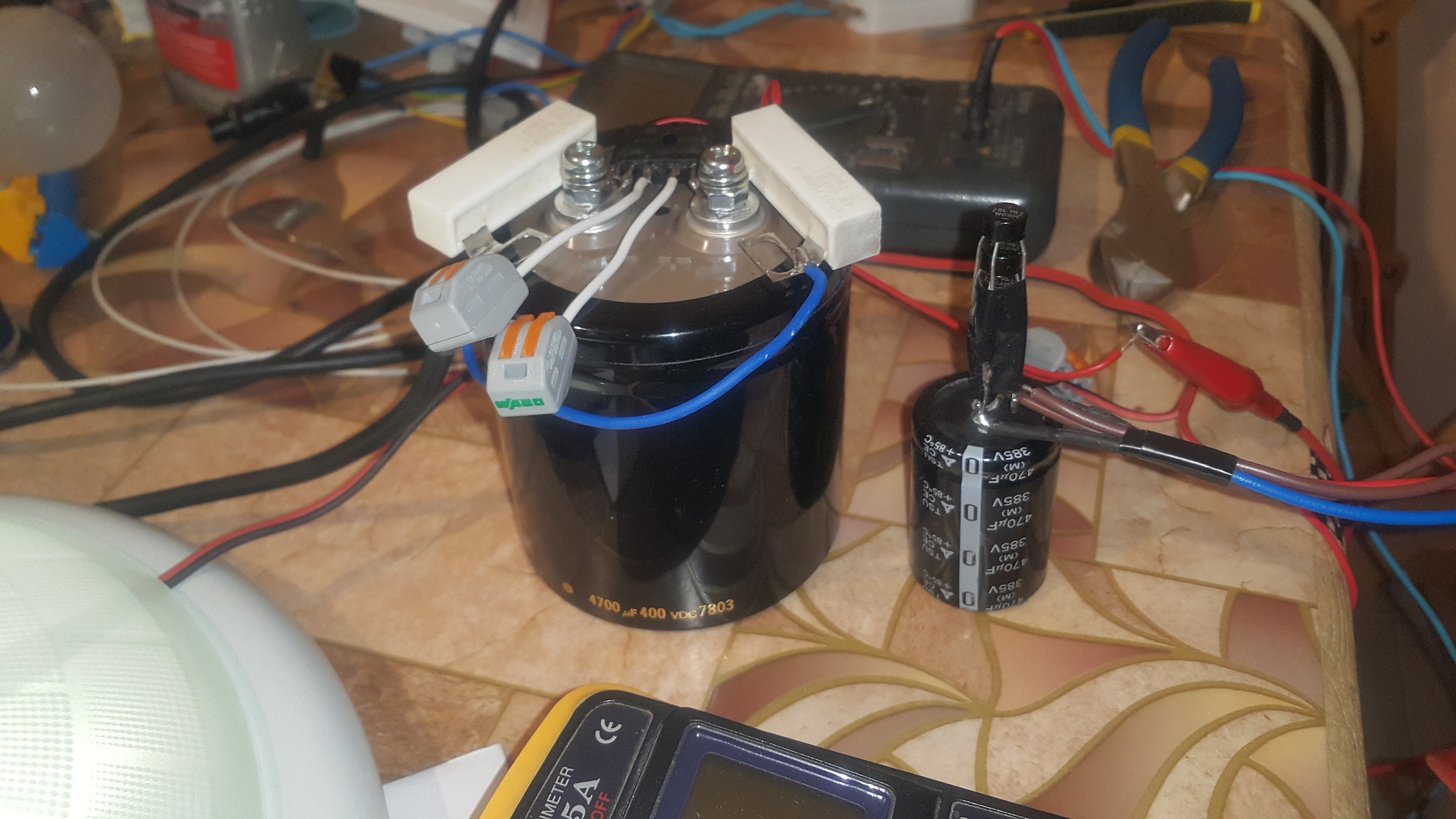 В момента със 220UF/400V между всяка платка 47R общо 705ohm тока е 75-80mA и свети по-силно от плафона с 1,4м лента (~28W) като трептенето с камерата на телефона е малко по-силно от на плафона с лентата поради обясними причини, тока там е 45-50mA а общото съпротивление е 1,4К но на око не се усеща, което е най важното, а моето око е много чувствително и веднага забелязвам трептенето което причиняват китайските лед крушки, докато брат ми вика няма смисъл от такъв капацитет ама аз си викам има щото аз го виждам!