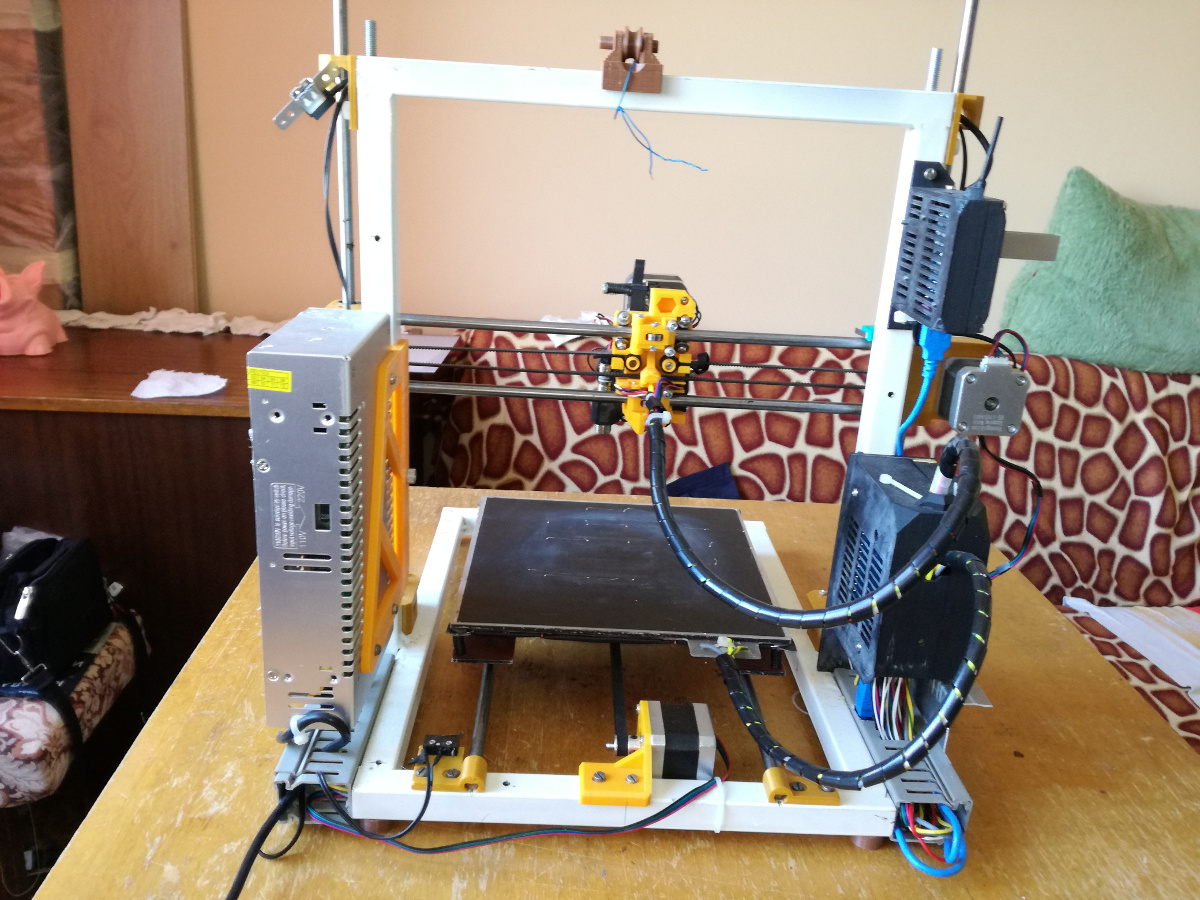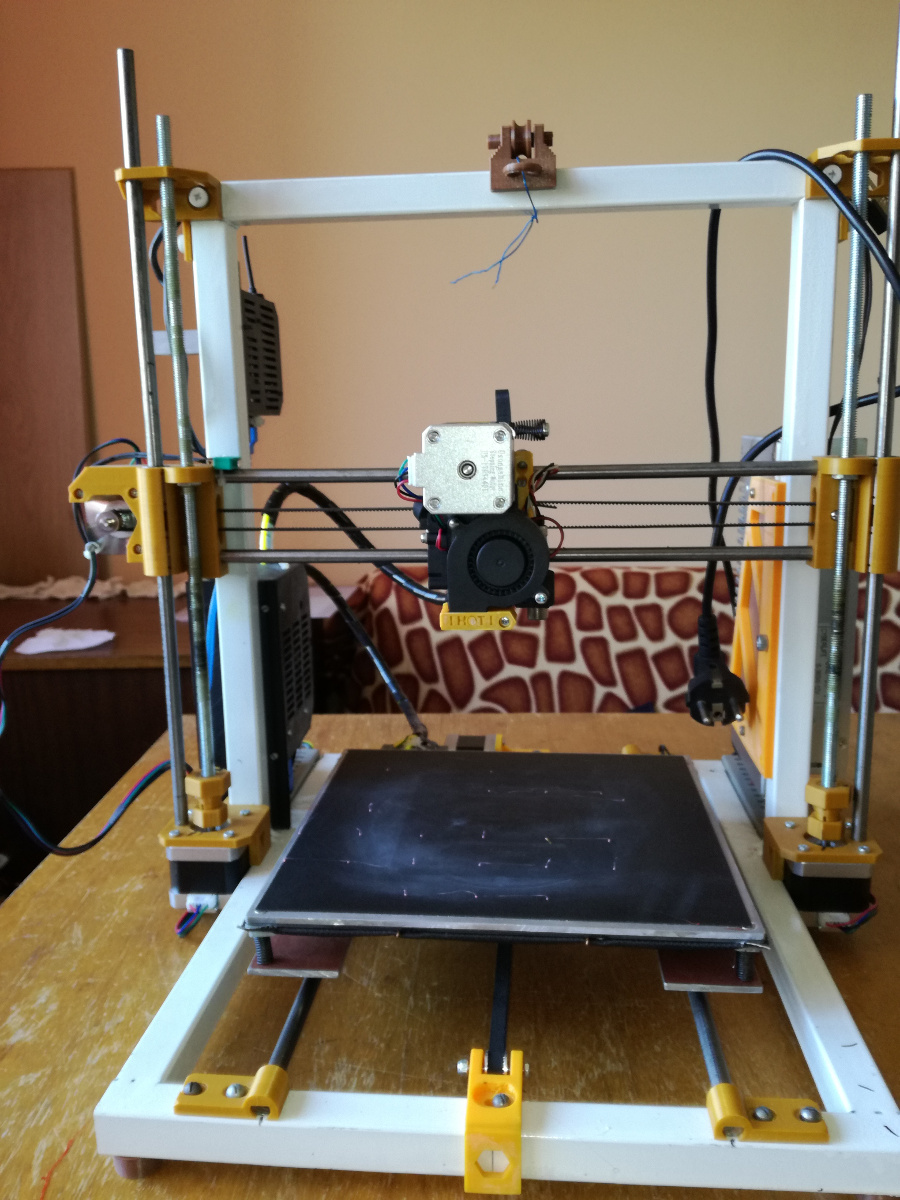Ей това е DIY по мой начин, заварена рама, придвижване по X и Y с радиални лагери по калибрована стомана, та дори и нагревателя на леглото е DIY.