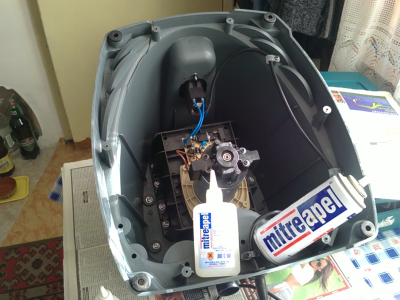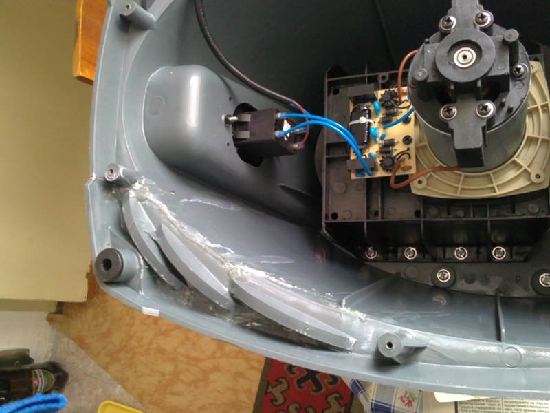 Два, три дни беше снежно, та само снимах вътре. Вижда се какъв е дефекта на пластмасата. Опитах да я залепя със секундно лепило за МДФ, но пластмасата се оказа келява и лепилото не издържа. Ще правя втори опит с полиуретанов "салам" , като сложа и допълнителни ламаринки с понитачката.