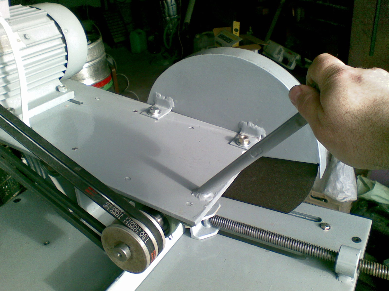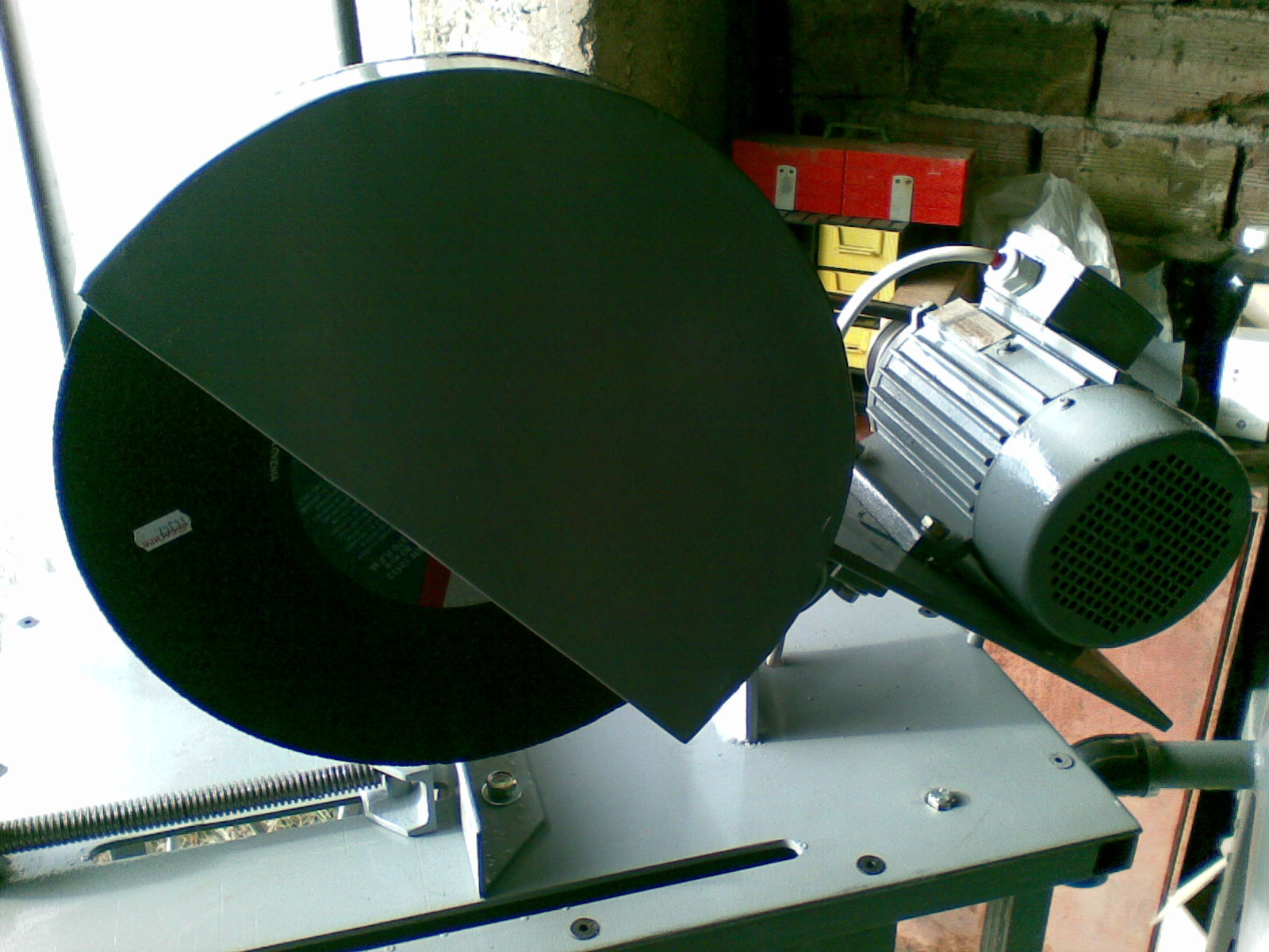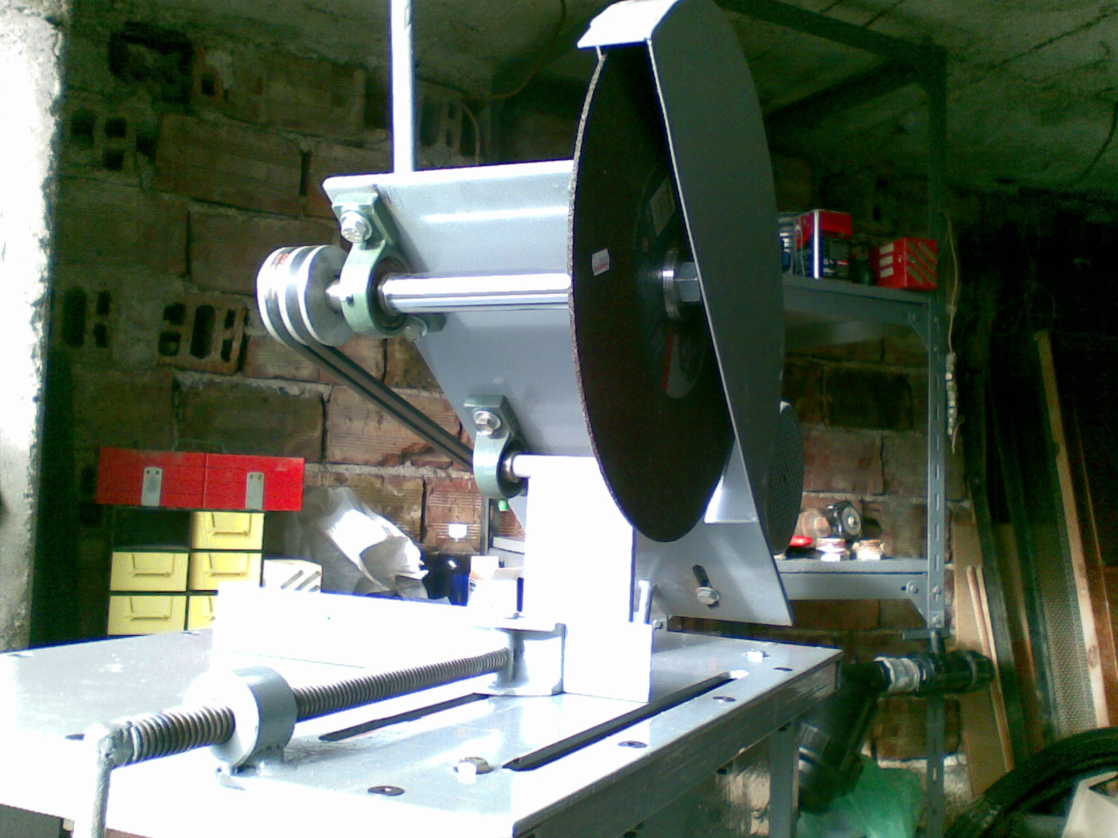 Какво за вала? Ф30 в най дебелата си част. Направен е от стомана 45 от бутало за хидравличен цилиндър.Шайбите са направени за дискове от ръчен флекс , и с втулка за диск Ф350. Двигател 2,2kW 3000об. Разликата в шайбите е минимална. Оста на люлката е от ос на ротор. Направил съм и нещо като корито под диска за улавяне на искрите. Още не съм рязал нищо, само я събрах днес и я развъртях. Не мисля да правя предпазител за ремъците. Винкела т.е. опората срещу винта на менгемето може да се завърта на 45 градуса. Успях да оползотворя няколко нощни смени. Ами така, докато работим да свършим и малко работа :-D