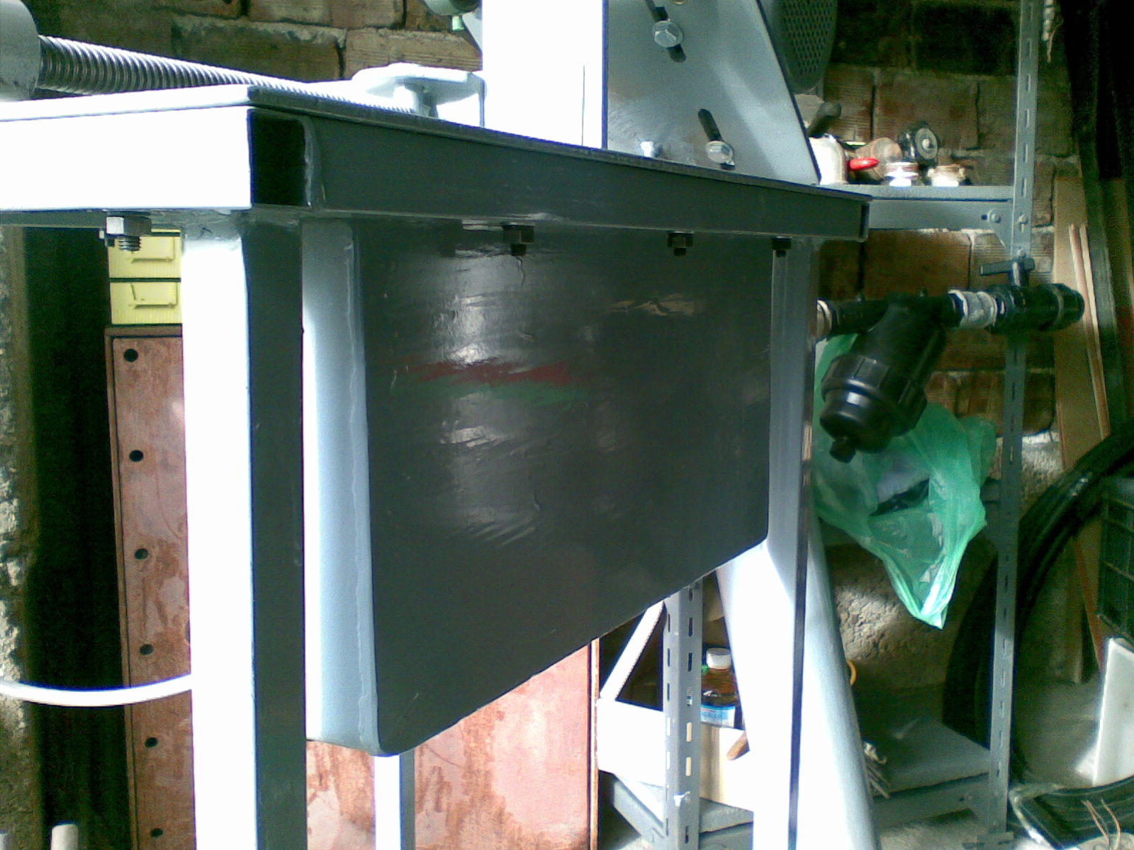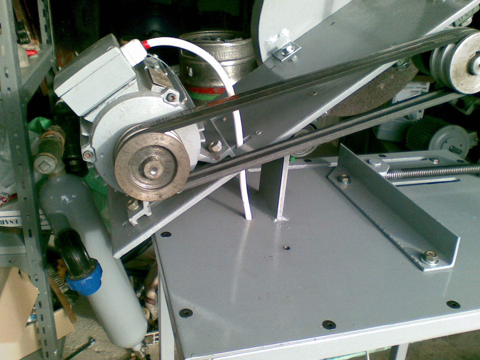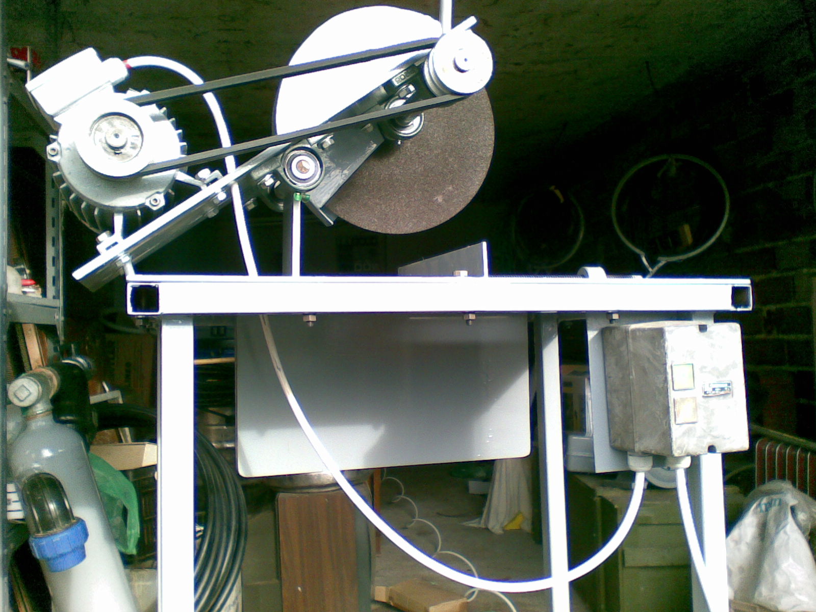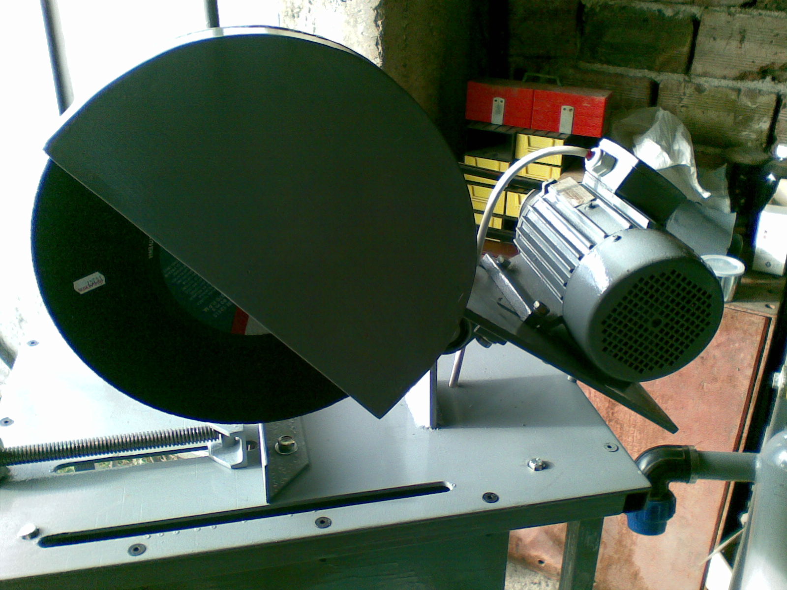 Какво за вала? Ф30 в най дебелата си част. Направен е от стомана 45 от бутало за хидравличен цилиндър.Шайбите са направени за дискове от ръчен флекс , и с втулка за диск Ф350. Двигател 2,2kW 3000об. Разликата в шайбите е минимална. Оста на люлката е от ос на ротор. Направил съм и нещо като корито под диска за улавяне на искрите. Още не съм рязал нищо, само я събрах днес и я развъртях. Не мисля да правя предпазител за ремъците. Винкела т.е. опората срещу винта на менгемето може да се завърта на 45 градуса. Успях да оползотворя няколко нощни смени. Ами така, докато работим да свършим и малко работа :-D