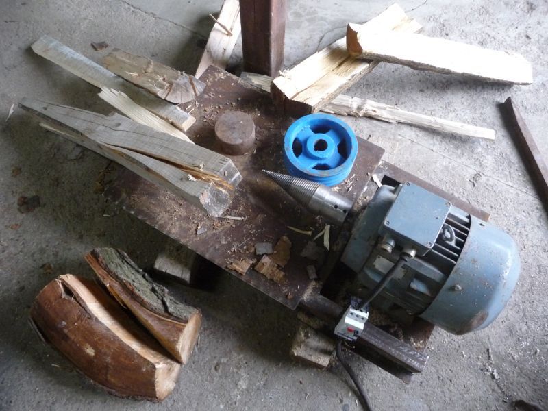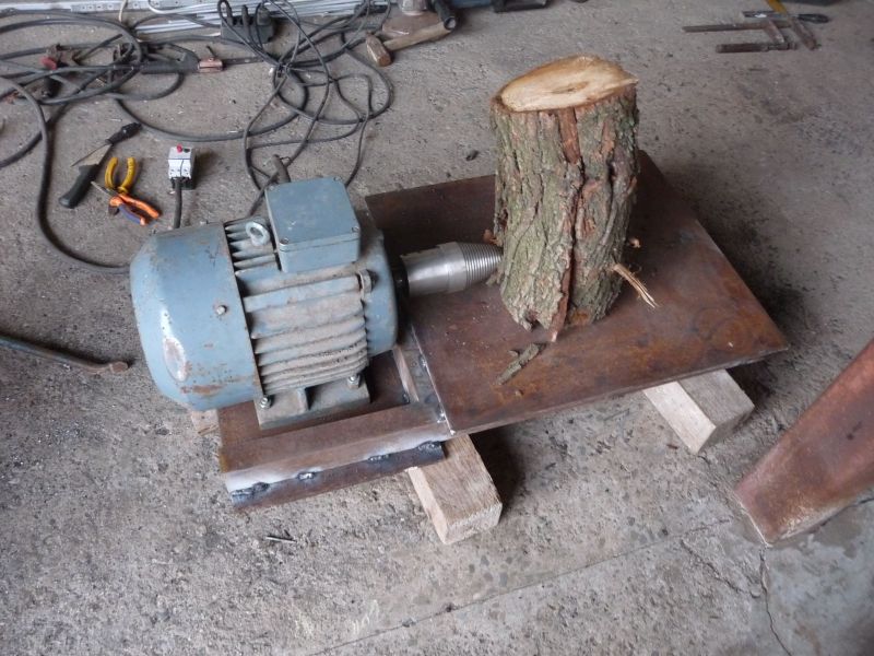 Реших и аз да си спретна една машина за цепене и си взех един конус 80мм . И от мерак веднага го монтирах на елмотора, който е нов - 5.5 кв 940 оборота трифазен /така го прецених - на табелата не може да се прочете - не мога да го вдигна и сравнявайки го с други мотори. И както си е на земята мотора с конуса взех да го пробвам - подадох му едно малко дъбово кютуче - цепна го. Въодушевен му подадох един по-голям ..... и и ела да гледаш на стари години как се играе казачок - мотора се върти с кютука и скача - и аз скачам ..... добре, че кабела се нави около оста и се скъса и аз слязох от масата... Деца, не правете това в къщи!....