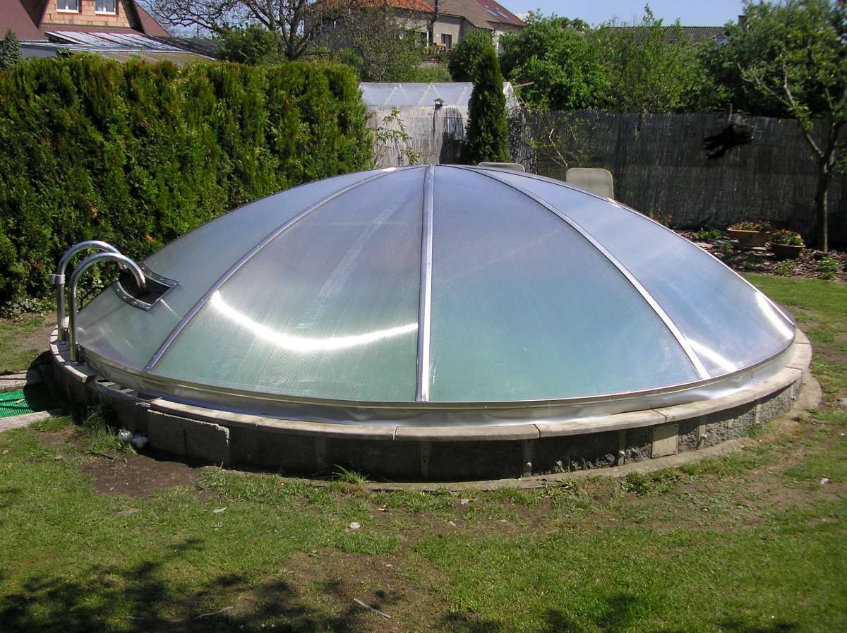 Решението - поликарбонат с алуминиеви профили. Две половини които покриват басейна и са като малък купол с наклон навън.