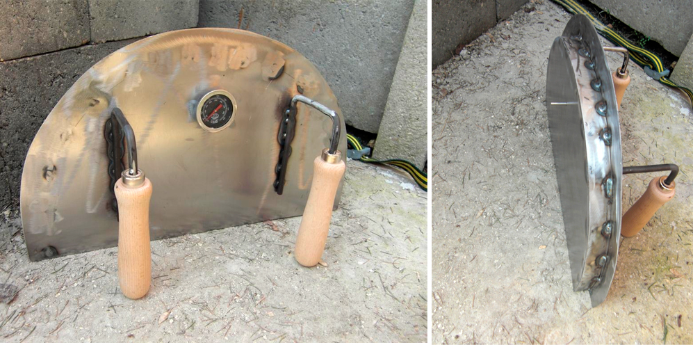 при този вид пещи които се загряват предварително е безмислено да слагаш термометър (еле пък еуектроника), тъй като няма как да увеличиш температурата когато веднъж си извадил огъня и си сложил тавите вътре. иначе когато саждите изгорят от стените тогава е пеща е достигнала достатъчна температура. разбира се може и по-рано ако ще печеш семки