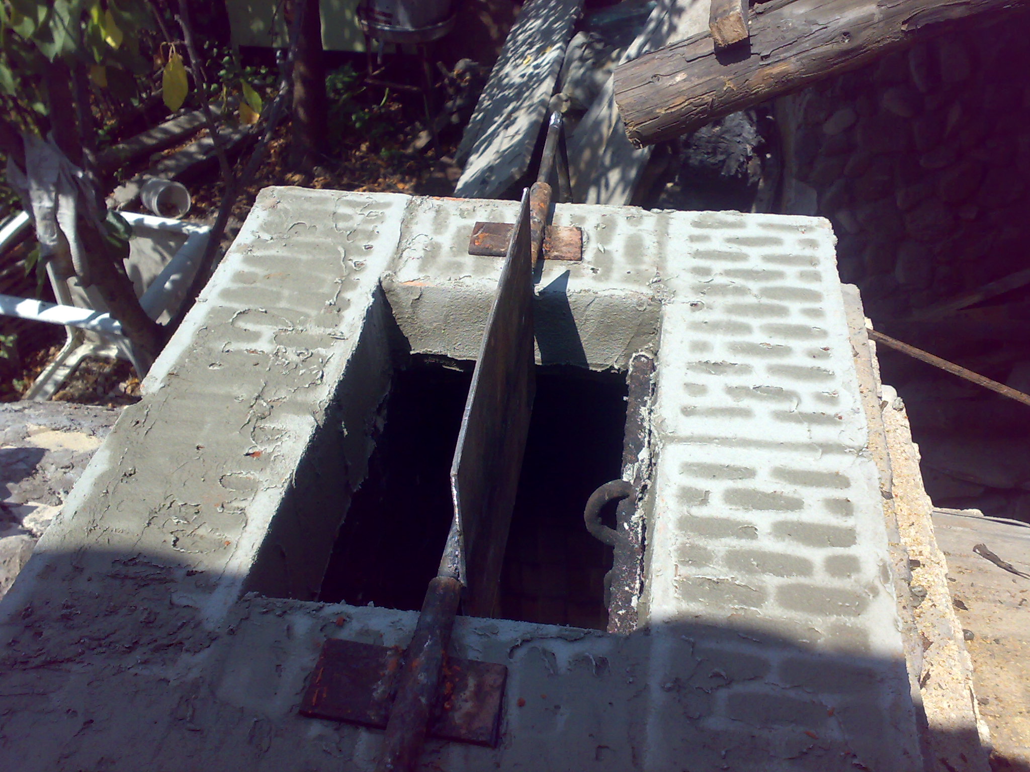 Някъде ги има чертежите из темата. Спомням си, че го зидах до входа на пещта ама като си ида в събота ще го премеря.