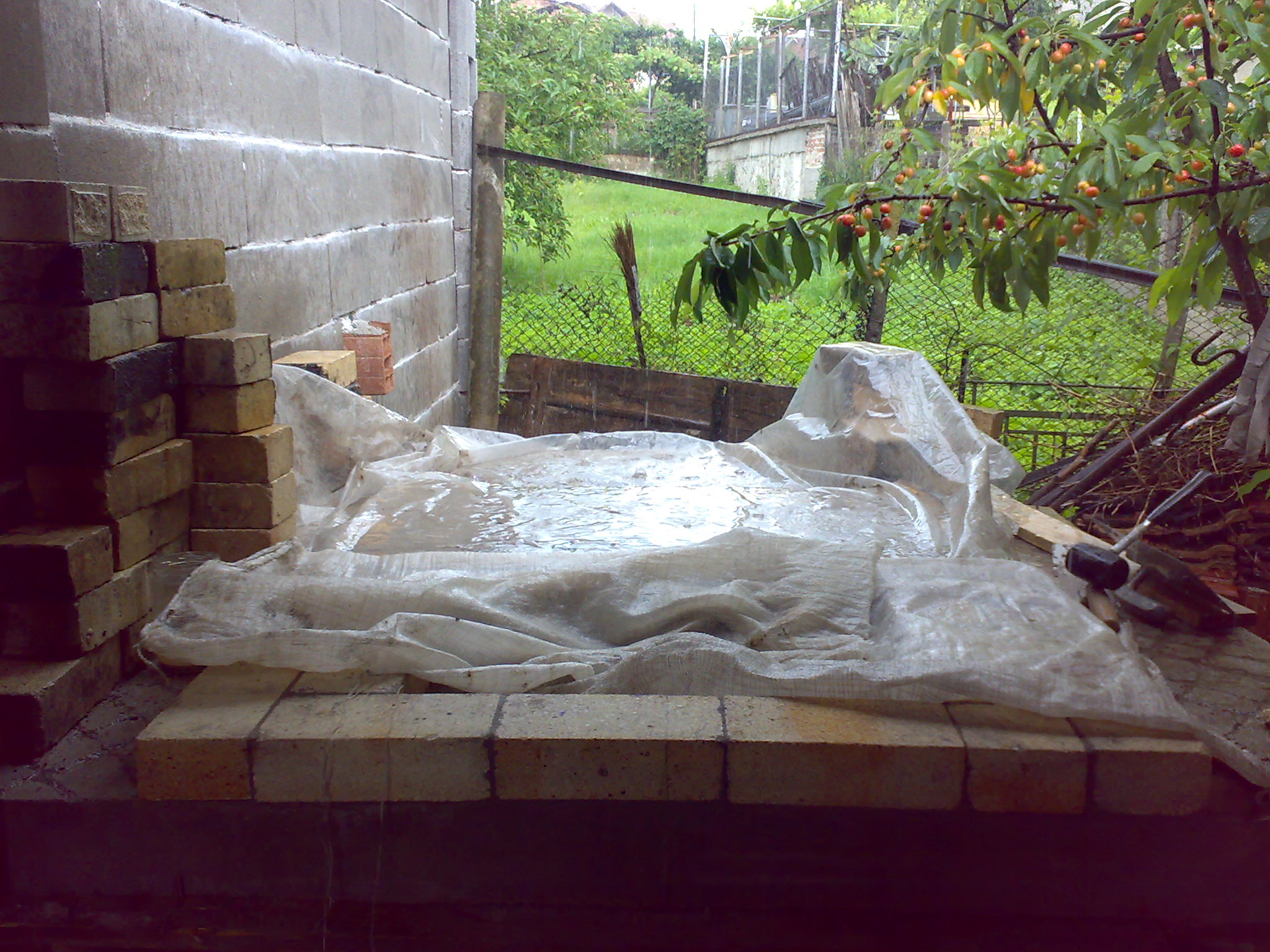 Такааа, днес стартирах зидането с шамот. На 5 кг. торба слагам 500 гр. сол/ готварска. Ама много върви този шамот, бе- 4 торби ги изпапах за нула време, още не съм наредил основата. А и времето не е с мен, пак заваля мамка му. До кога..... навремето във Виетнам и Камбоджа беше така