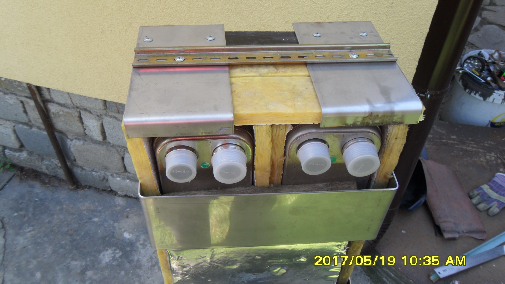 Ясно се вижда изолацията с дебелина 25 мм, а между топлообменниците без да искам и по щаслива случайност съм я удвоил до 50мм.