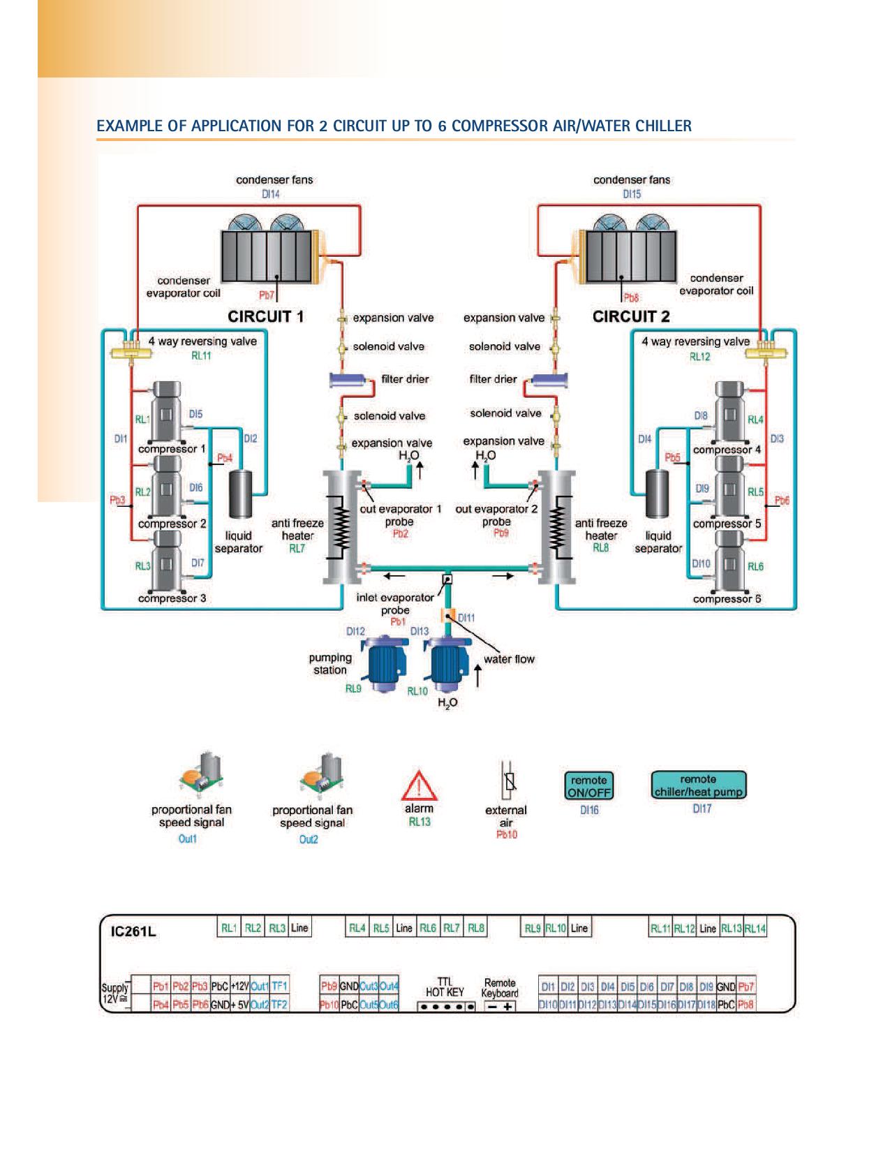 Добър вечер на всички знаещи и можещи специалисти от форума! В прикачения файл има схема на термо-помпена система с контролер на DIXELL, управляващ два хладилни кръга с до 6 компресора. Бих искал да попитам следните неща: