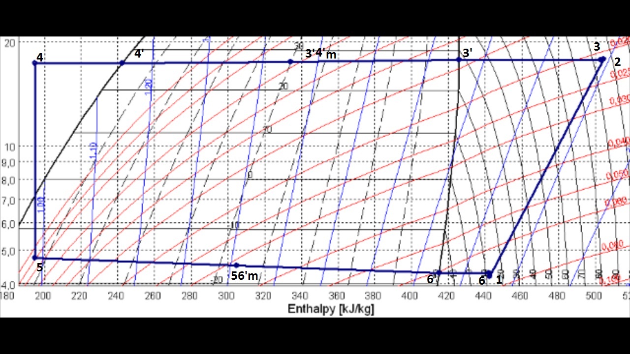 На диаграмата R410a, са отчетени спадове на налягане и на температура, "КПД" на компресорa.