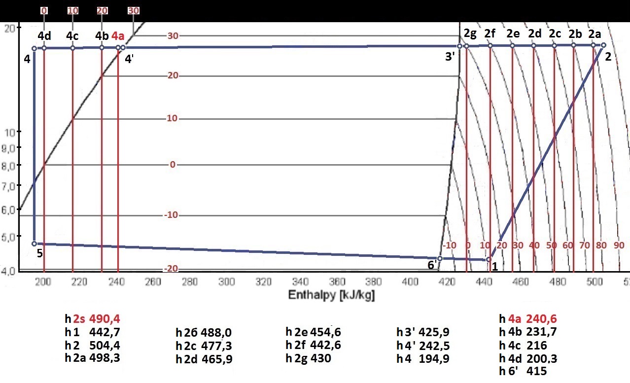 За да не се стига до кондензация във десуперхийтъра , (Ахмаков може би ще ни каже защо не бива ) е достатъчно да спрем процеса на 5-7 градуса преди точка 3' . Просто се придвижете мислено по линията на кондензатора надясно от точка 3' със 7 градуса (гледайте къде са температурните криви на 40 и 50 градуса ) , спуснете се вертикално до абсцисата и засечете колко е енталпията там . - 430 . (на око . Не съм ползвал линийка ).