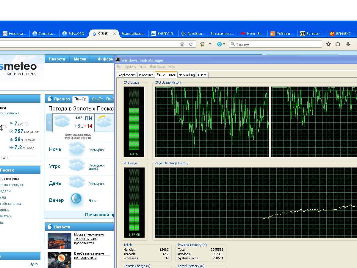 Иначе по темата сега нарочно пуснах лисицата на 40 прозореца от които десетина от Ютуб да работят с видео и не усещам съществено забавяне. Не лапа повече от 520 мегабайта рам. Даже като ги стигне ги връща на 420 и пак почва да си ги пълни. Отделно гледам и филм с гом плеара. И той лапа толкова рам. С ХП съм 3 гигабайта мога да ползвам от 4, че е 32 бита. Антивирусната е на майкрософт безплатна. Единствено процесора шари от 35 до 70% като превключвам между подпрозорците. Процесора е двуядрен Т4200 на 2гига. Вероятно имаш друг проблем.