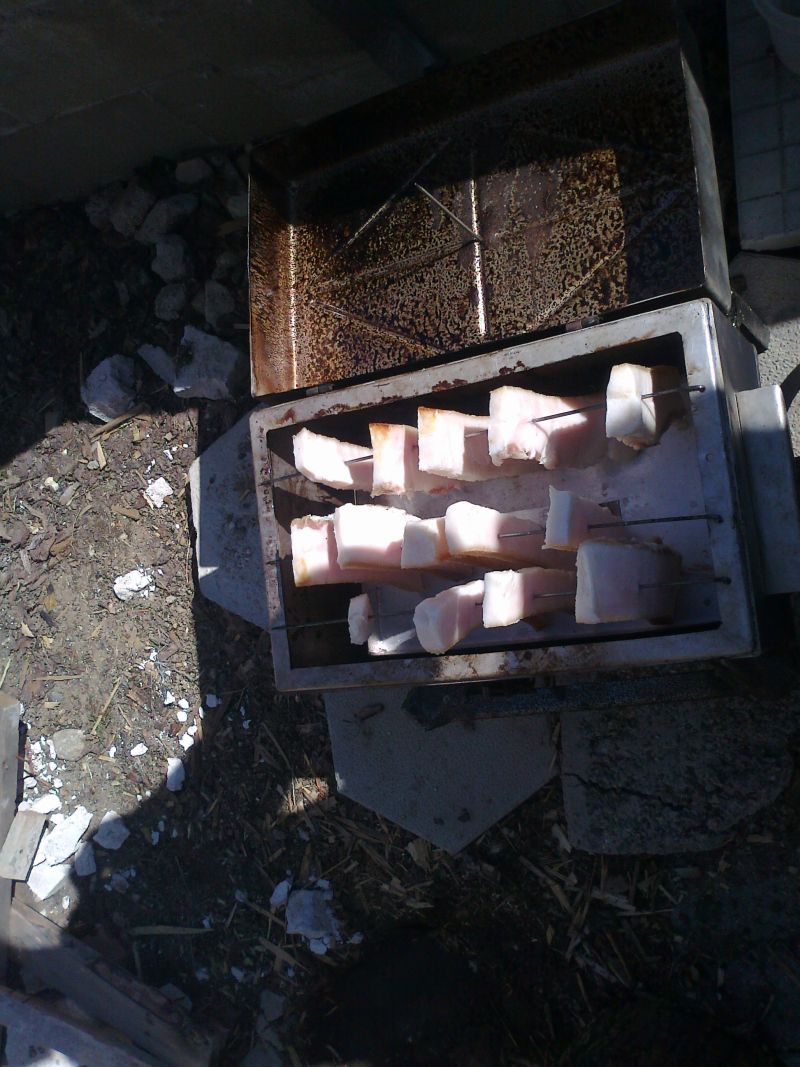 Отдавна се каня да си опуша малко сланинка и днес времето даде ръка. Беше топло и приятно и заредих ,,коптильня-та" с един голям ,,брус" сланина нарязан на ,,филии" :) След като я опуших я натепах с червен пипер, намазах с чеснова паста и я окачих на хладно да оветри два- три дни. Дали ще стане? Чакам с нетърпение :partyman: