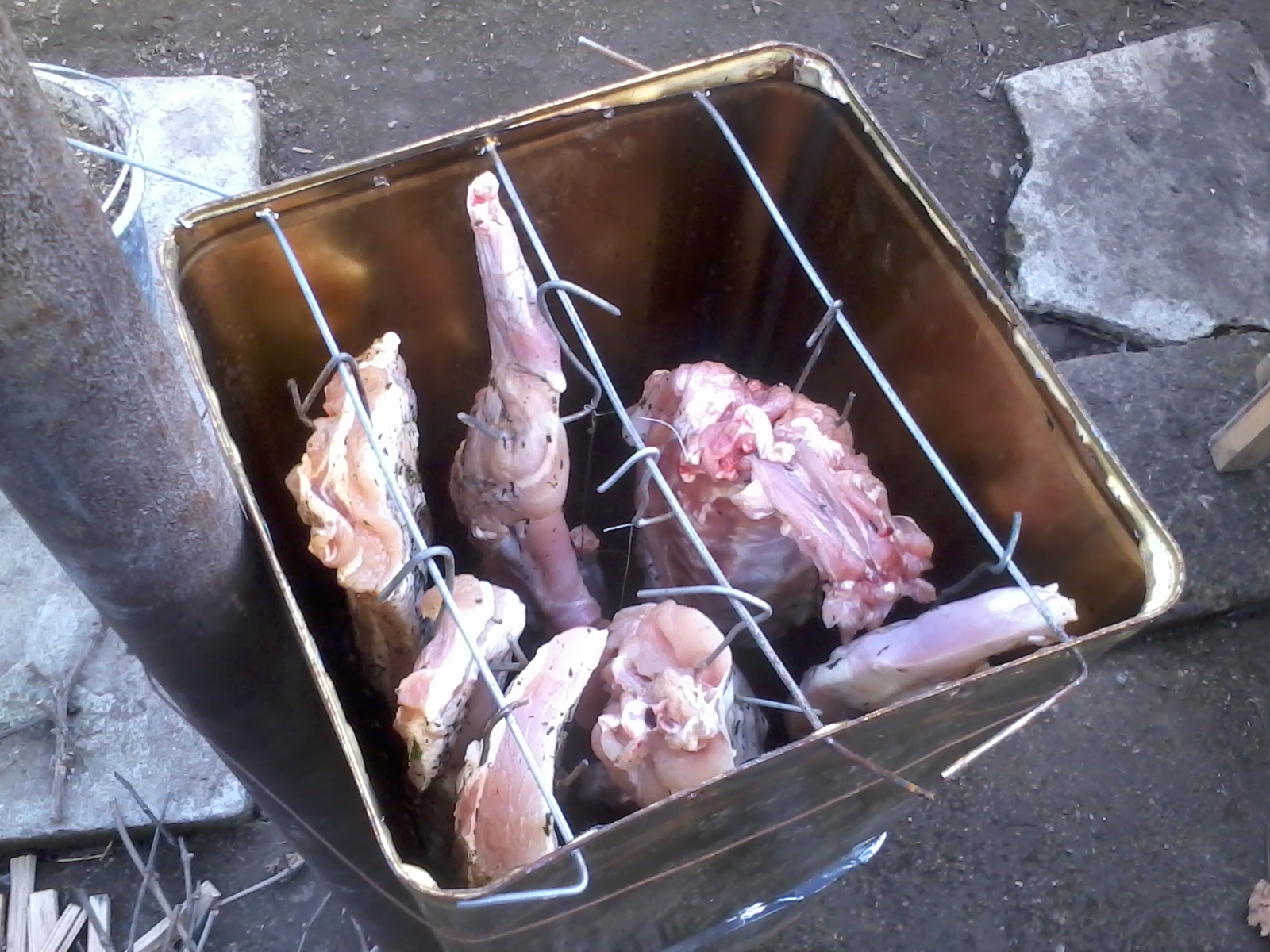 [/img].Заека го нарязах на части че не можа да влезне целия в тенекията.Всичкото месо го сложи заедно и опушвах 5 часа.[img]