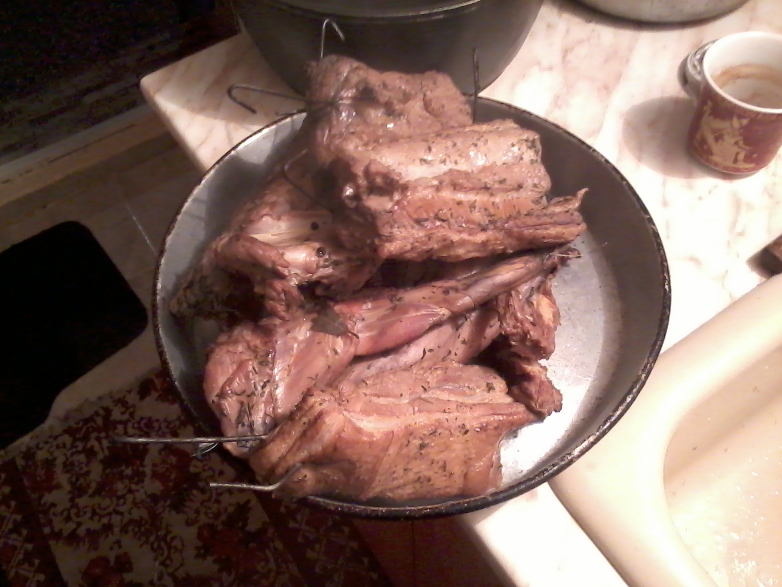 Да споделя моя първи опит е в опушването.Материала бе един заек и свински гърди.Мариновах ги по рецептата на Илчо-1,1кг сол на 10л.вода.Заека го киснах 48часа,а свинското 6 дена.Това е материала преди опушването[img]