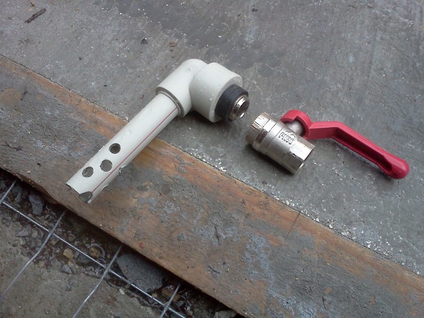 Понеже бидоня е оребрен в долната част, го пробих за канелка на 15 см височина и монтирах следното ( по идея от темата):