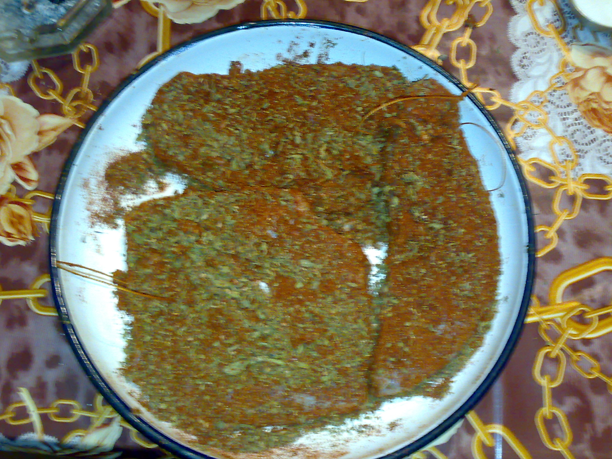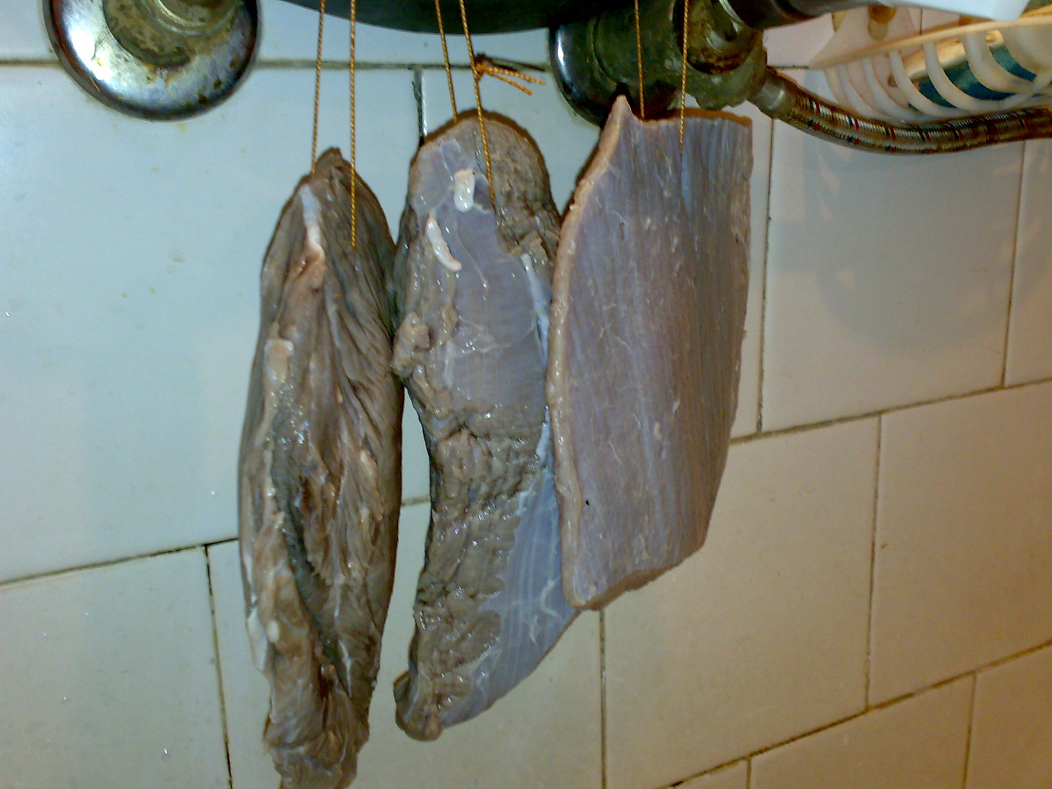 Вчера ги посолих обилно и ги оставих да си почиват 24-5-6 часа. Днес ги измих и ги оставих за час и половина във вода с оцет. В една торбичка смесих подправките като хубаво раздрусах торбичката. Натрих обилно филенцата със счукан чесън и ги овалях в смесеницата. После по една дупка, канап и в хладилника. След десетина дена ще видим
