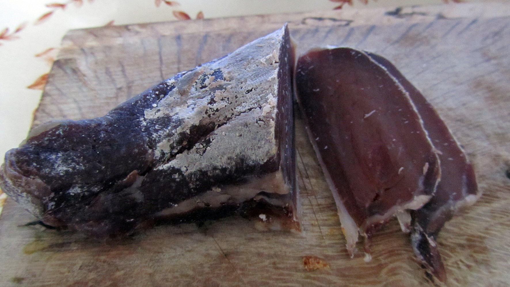 Поседя 1 седмица да съхне и го порамчих да го нося на търговеца да си го яде той. Той па го немА, но по телефона рече да го оставя повече време да съхне. Бих казал, че става. Даже май пак ще го ползвам. Доста по-различно е от досегашните ми пастърми. Получи такава плесен като луканките. Почти безсолно, но има някакъв вкус. Като плюсове виждам много по-лесното приготвяне и пастърмата е мека и крехка. Като минус ще посоча вкуса, защото съм свикнал на доста по-солени и подправени. Съмнява ме, че нещата вървят на комбинация от осоляване с това, с добавка пиперосване при сушенето.