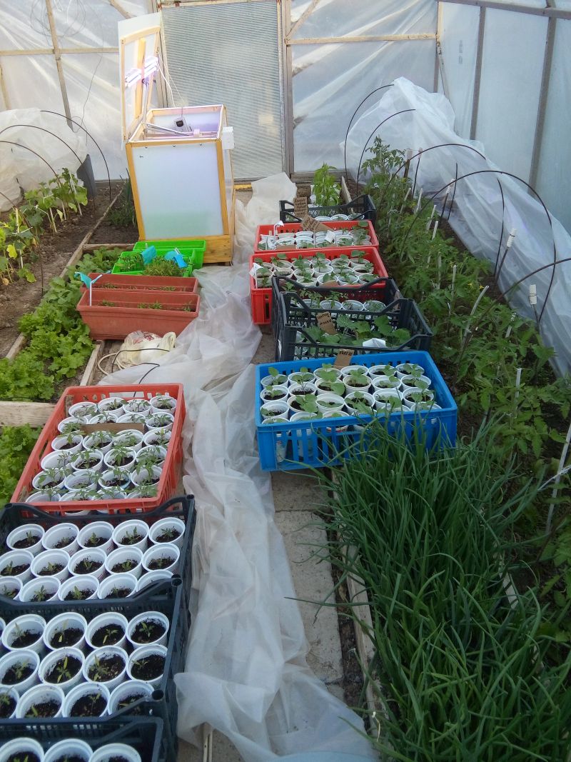 Оранжерията не ме изложи и тази година.Домата е на втора китка - одоматен. Имам краставичка 3 см.И останалия разсад расте нормално.