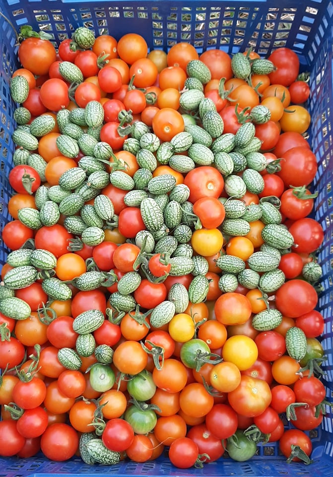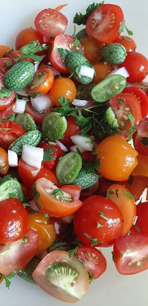Не набрах много, но добре че имах 3 корена някакви мексикански краставички, та имаше за салата. Ето моята шарена салата, но миналогодишна: