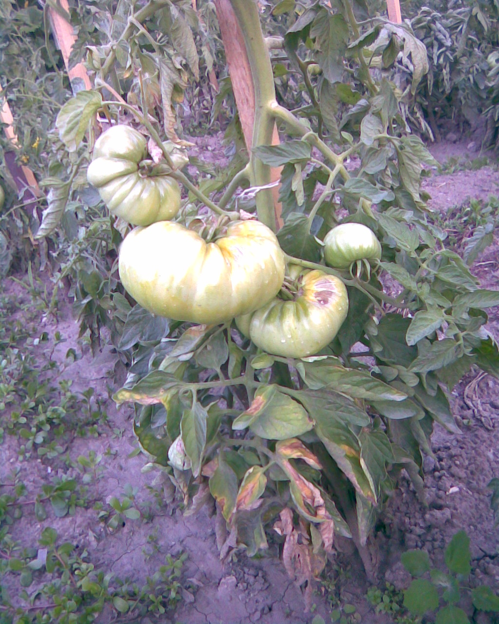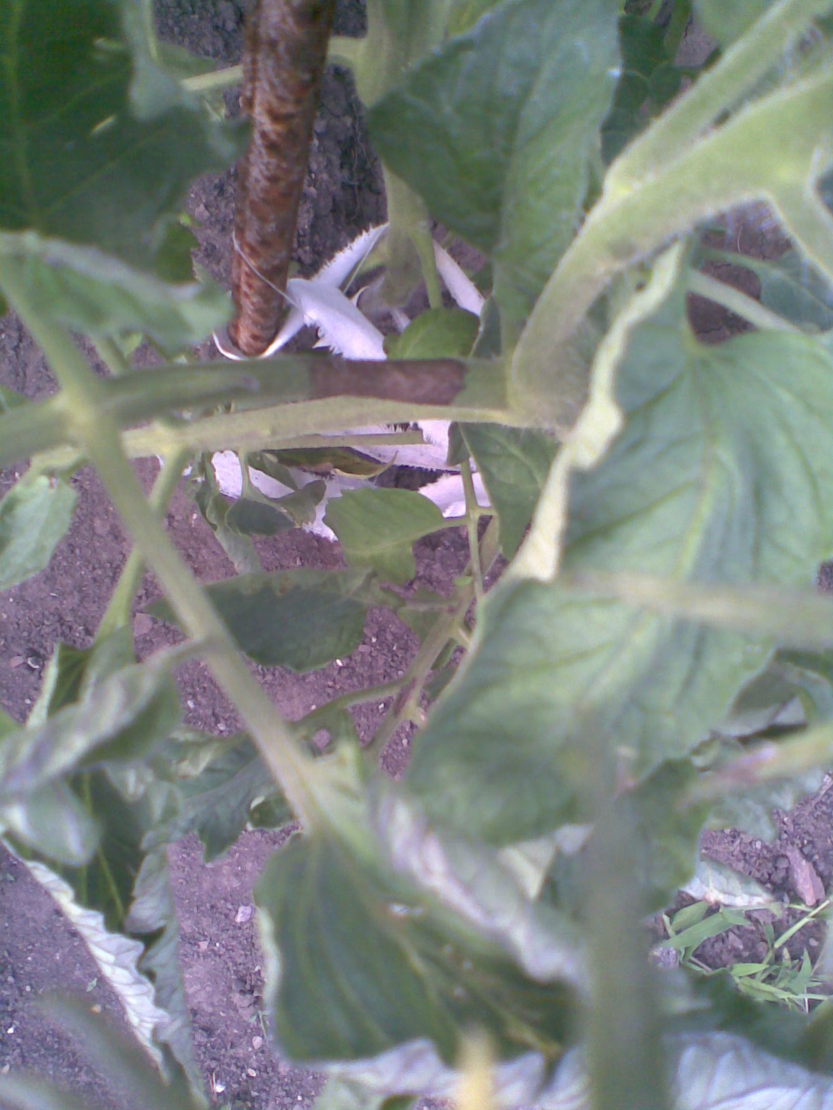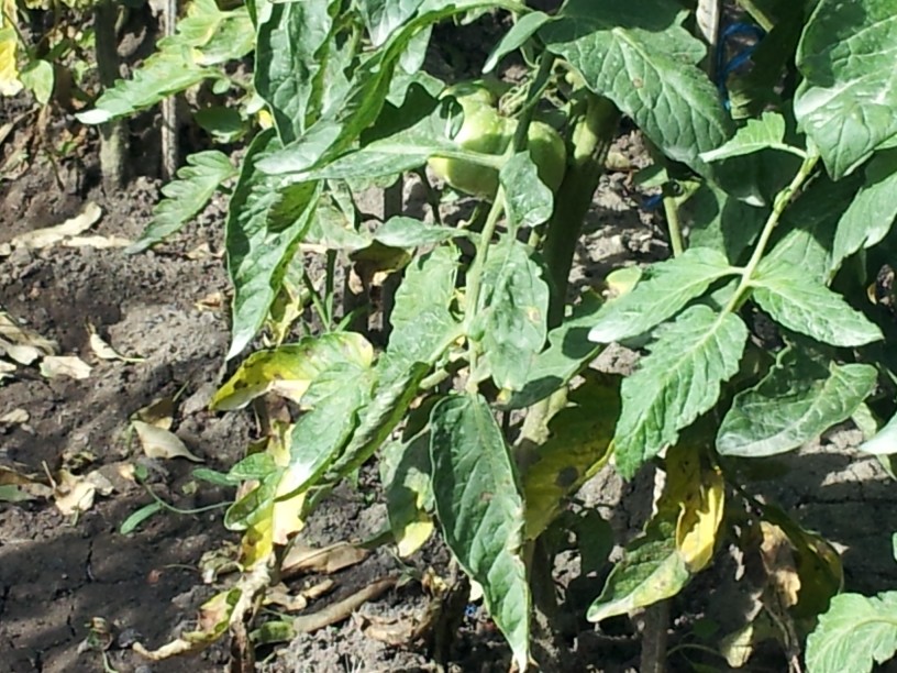 Може и да си прав, но аз торих, когато растенията бяха 1 педя. Това не е моя снимка, но и при мене е почти същото, макар и по-слабо огънати листа. Засегнатите стъбла са 1/3 от всички и то произволно разположени. Има някои домати/плодове/, които приличат на мутанти
