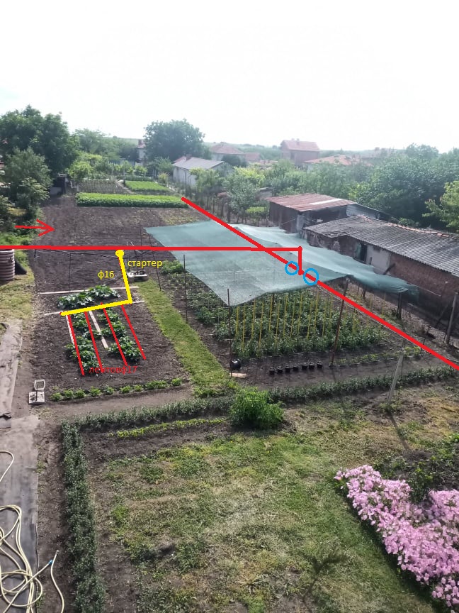 - Намерих една снимка от м. май мината година. Надявам се на по голяма пригледност..уж. Бидона е вляво, не се вижда. Филтъра след него. Сините кръгове са спирателни кранове. Така си изолирам половината от поливната площ при избор. Пример съм начертал само с краставиците. жълтата точка е стартер, останалото мисля е ясно. В далечината се виждат картофи които съм поливал само с един стартерен крана ф16 захранващ всичките 8 реда по около 10 метра. Ясно е, че като ги поливам само на тях пускам всичката вода от бидона. Между тях и замреженото впоследствие имаше корнишони, късни краставици безколов домат, босилек и царевица. Не казвам, че всичко съм поливал наведнъж, то с един тон няма как. Но с премерена етапност никога не съм имал недостиг на поливна вода. Отделно малки количества торове и микроелементи ги разтварям и директно в бидона. Филтъра го чистя горе-долу веднъж седмично. Естествено при теб обстоятелствата да са други, но с повече информация грешките ти ще бъдат по-малко.
