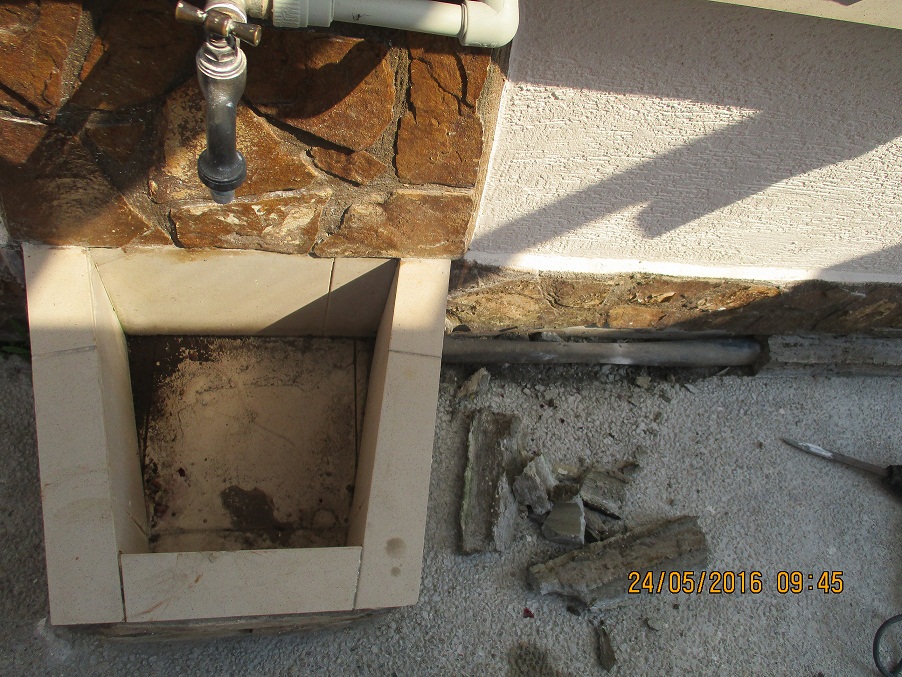 Аз пък не мога да схвана ВиК мисъл на незнайния строителен герой в това изпълнение - нещо, като дренажна канализация за мивката в барбекюто... Близо три метра тръба срязана на половина