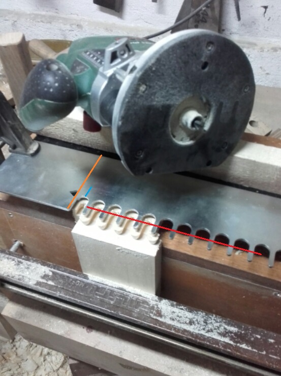 Аз гледах от един сайт и незнам позиционирането дали ми е точно но като сложа г образните водачи на шаблона ще бъда по-прецизен.Само да преговоря ако трябва да коригирам ме скастри.15мм ми дават да е разстоянието от края до дъното на джоба демек червената линия.После имам едно триъгълниче показано ми е че хоризонталната се поставя по ръбът му .Между двата зъба разстоянието е 21,5 демек деля на 2 и толкова е презастъпването.Само незнам дълбочината на фрезоване дали играе даден е фрезер 12,7\12,7аз го ползвам на 100%.