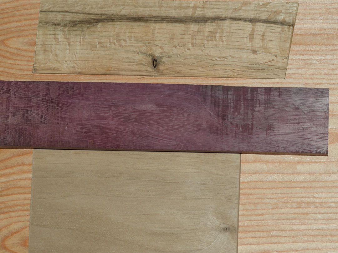 На снимката пурпурно сърце, отгоре въпросния цер от началото на темата, отдолу светъл орех, върху фурнир от череша.