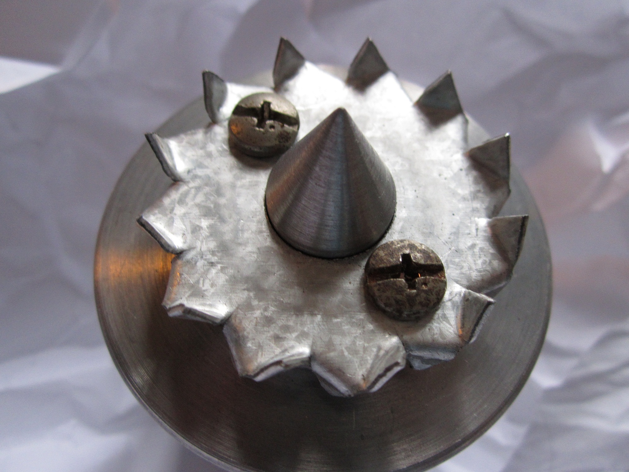 Искаш да кажеш,че шпилката която минава в средата подобно като на винт? Аз взаимствах дизайна от морзов конус с идеята да обработвам дървени трупи с диаметър 47 см на бавни обороти понеже правя скулптури.А Че е дебело,дебело е защото ме беше страх да не се отчупи нещо от тризъбеца от тежките трупи и конуса поема цялата тежест а зъбчетата ги завъртат.