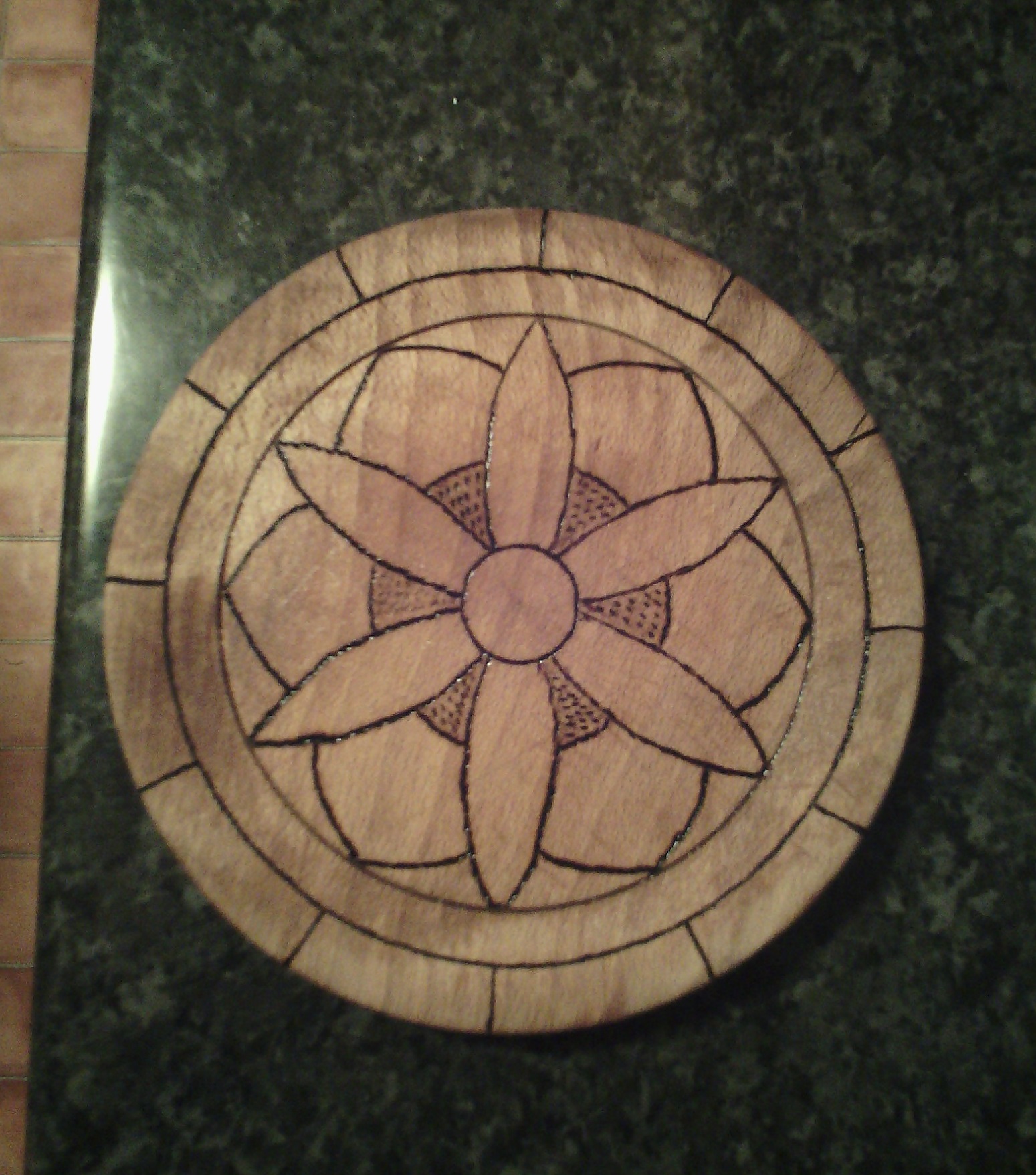 Жертвата е подложка за горещи съдове и си нямам на идея от какво дърво е. Самото горене го направи щерката. А в процеса на работа видях че трябва да направя малко конструктивни промени защото като позагрее и контактите нещо отслабват и самата ръкохватка почва да грее повече от нагревателя.