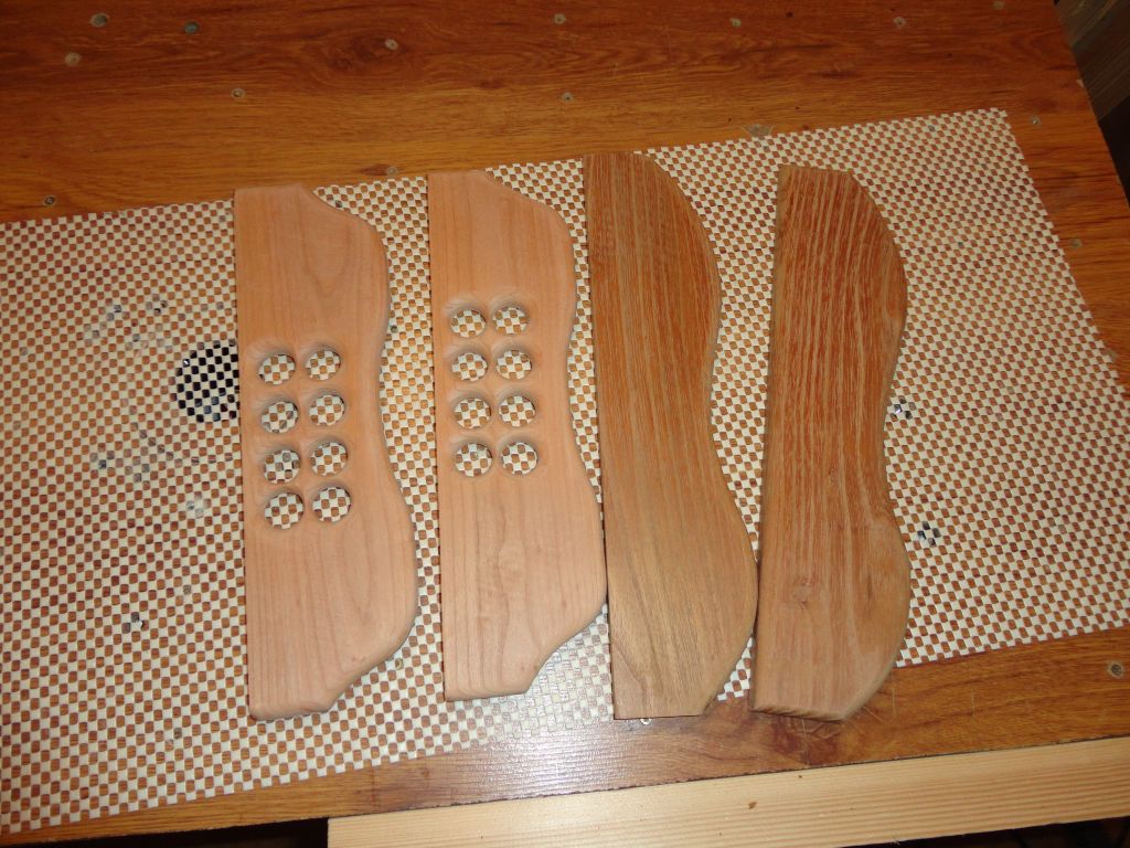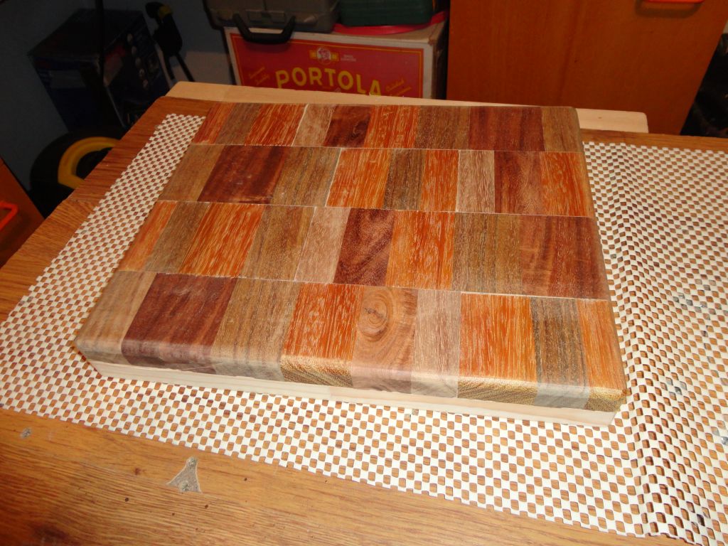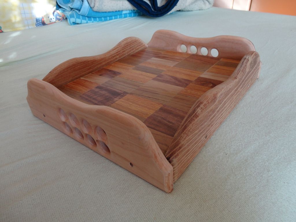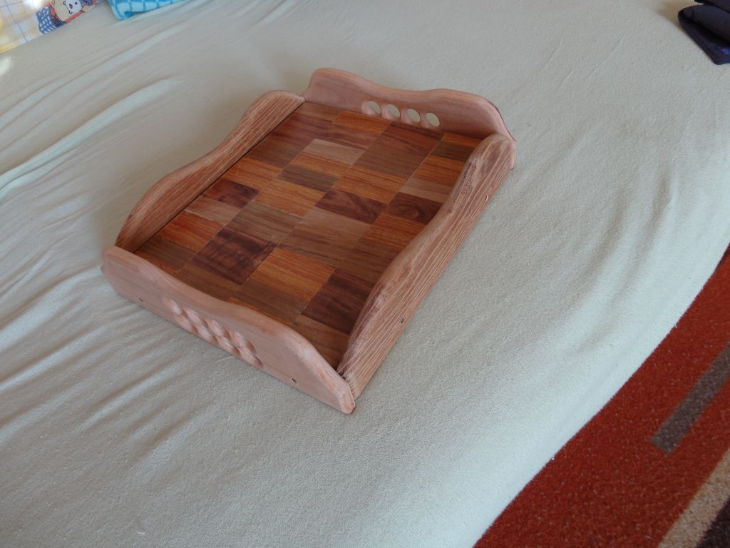Коледен подарък за любимата тъща, за ми носи кафе и закуска сутрин. :lol: Не е от днес, от последните няколко дена е.Направен е от парчметии от паркетини и малко чам.Основата е две чамови парчета, отгоре са залепени парчета екзотична дървесина.Рамките са от парчета от екзотични паркетини, два цвята - бяло и кафяво дърво.Нищо не е лакирано, само е прешлайфано, ще си остане така, на естествена дървесина без никакво покритие.Плота е полиран.