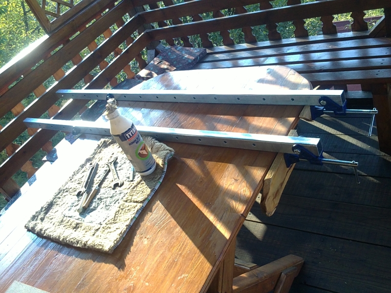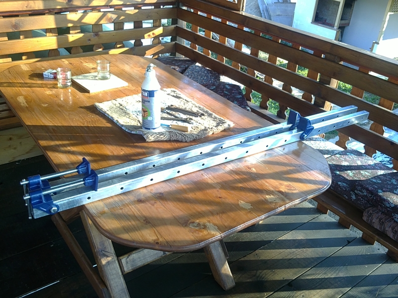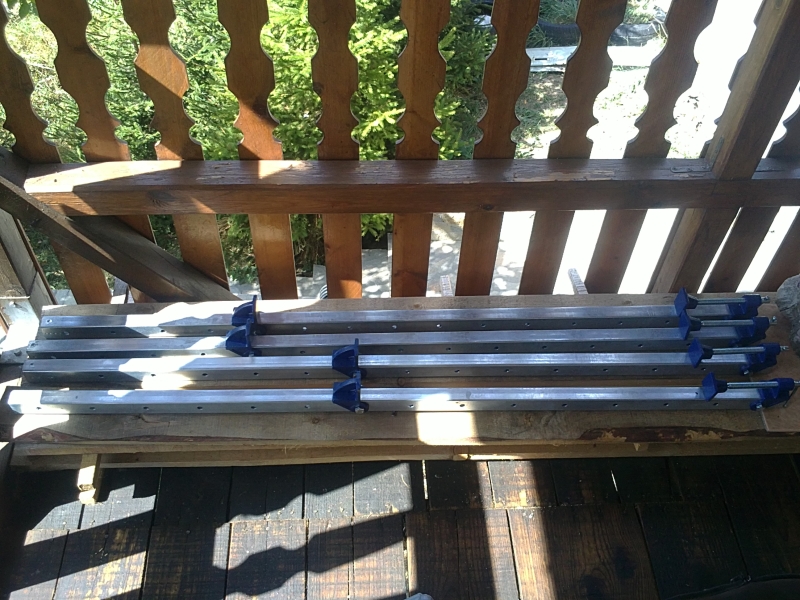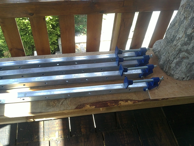 Пролетта взех един комплект дърводелски стеги ( от Рутландс-Nиколсон ги беше показвал) Kато дойдоха се оказаха върли китайци, даваха ги за дъска 25мм, а вътрешния размер играеше на 28-29mm. Отделно заради отливането имаха и леарски ъгли за лесно вадене от калъпа. Преди две седмици ги занесах на приятел фрезист и станаха всички на 30,2 мм вътрешен размер. От Зико взех кутия 6м -40х30х3мм - резнах ги на размер 1,5м, идеално права и калибрована е. Пробих отвори за всяка глава и пета- надписах ги, защото се оказа, че отворите са с различни центри.