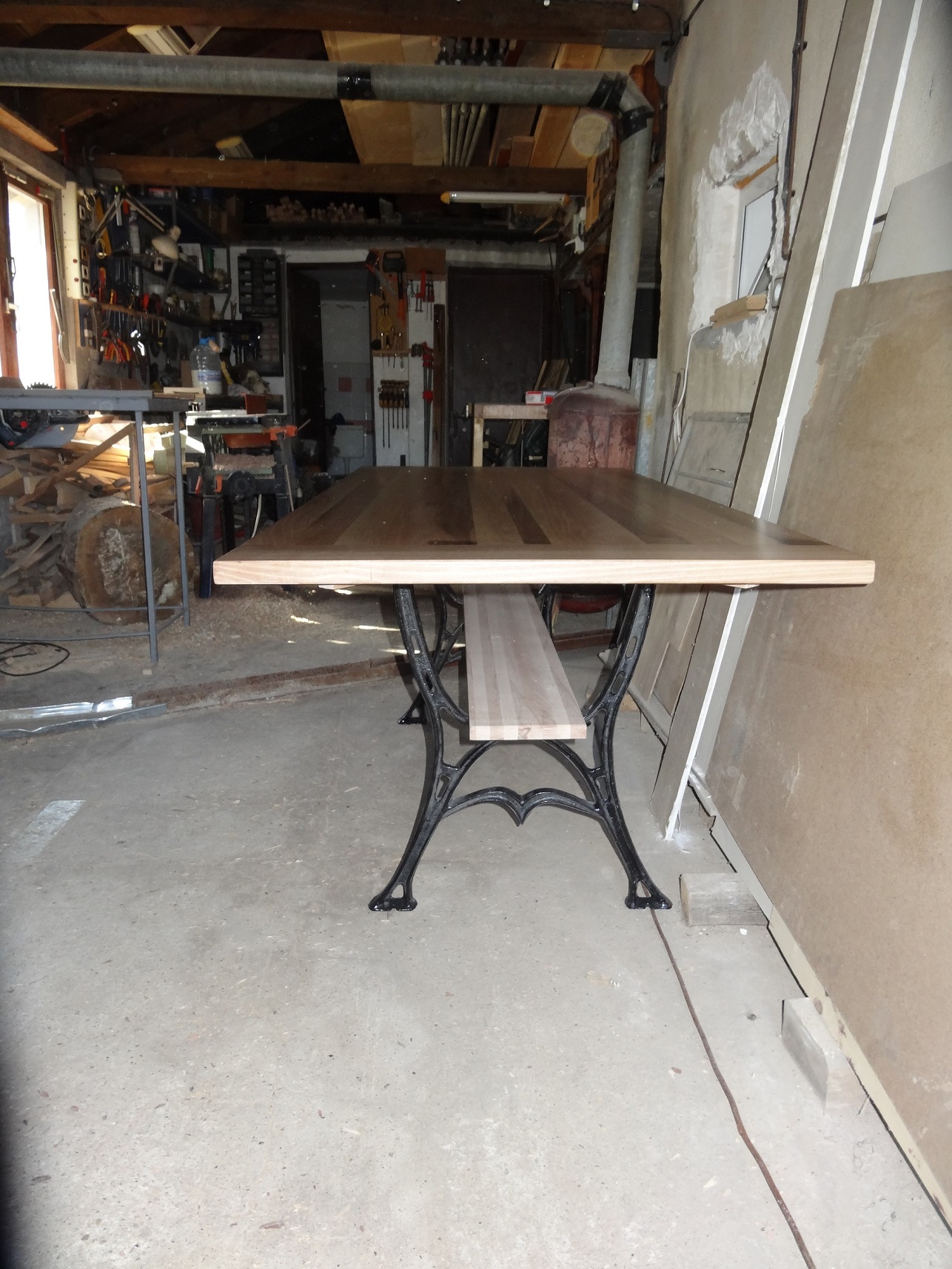 Материала е орех, дебелината на плота се получи 3.4 см, всичко е лепено със сглобка. Долният малък плот е от бук, той се получи около 3 см. Всичко е заглаждано със N5 и 5 1/2