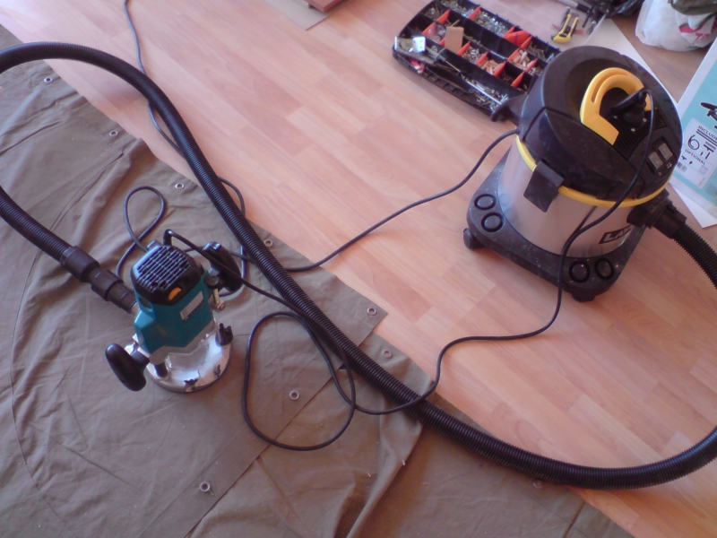 За прахосмукачка използвам леко преправена за домашна употреба. Тя стандартно си е с постоянна торбичка, но ми омръзна да я чистя и приспособих монтаж на хартиена. Сега тя се пълни само с най-финия прах и постоянната торба служи за резервна ако се скъса хартиена, което понякога се случва.